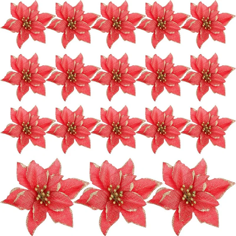 [50 шт./упаковка, Рождественский блестящий цветок Poinsettia] Упаковка из 50 рождественских блестящих цветочных украшений Poinsettia, лепестков, ткани и блесток. Каждый цветок poinsettia appr. 5 дюймов в диаметре. Добавьте немного блеска и блеска к вашей рождественской елке.