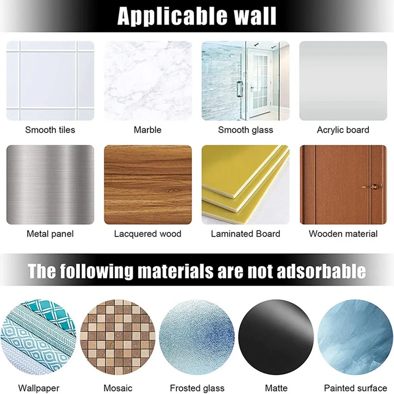 Caution- suction hooks work on any smooth and non-porous surface such as glass, metal, ceramic tiles, plastic, etc. suitable. Cannot hold their own on porous or rough surfaces: marble, paint wall, porcelain, nano tiles, plaster and wood, or over mortar lines.