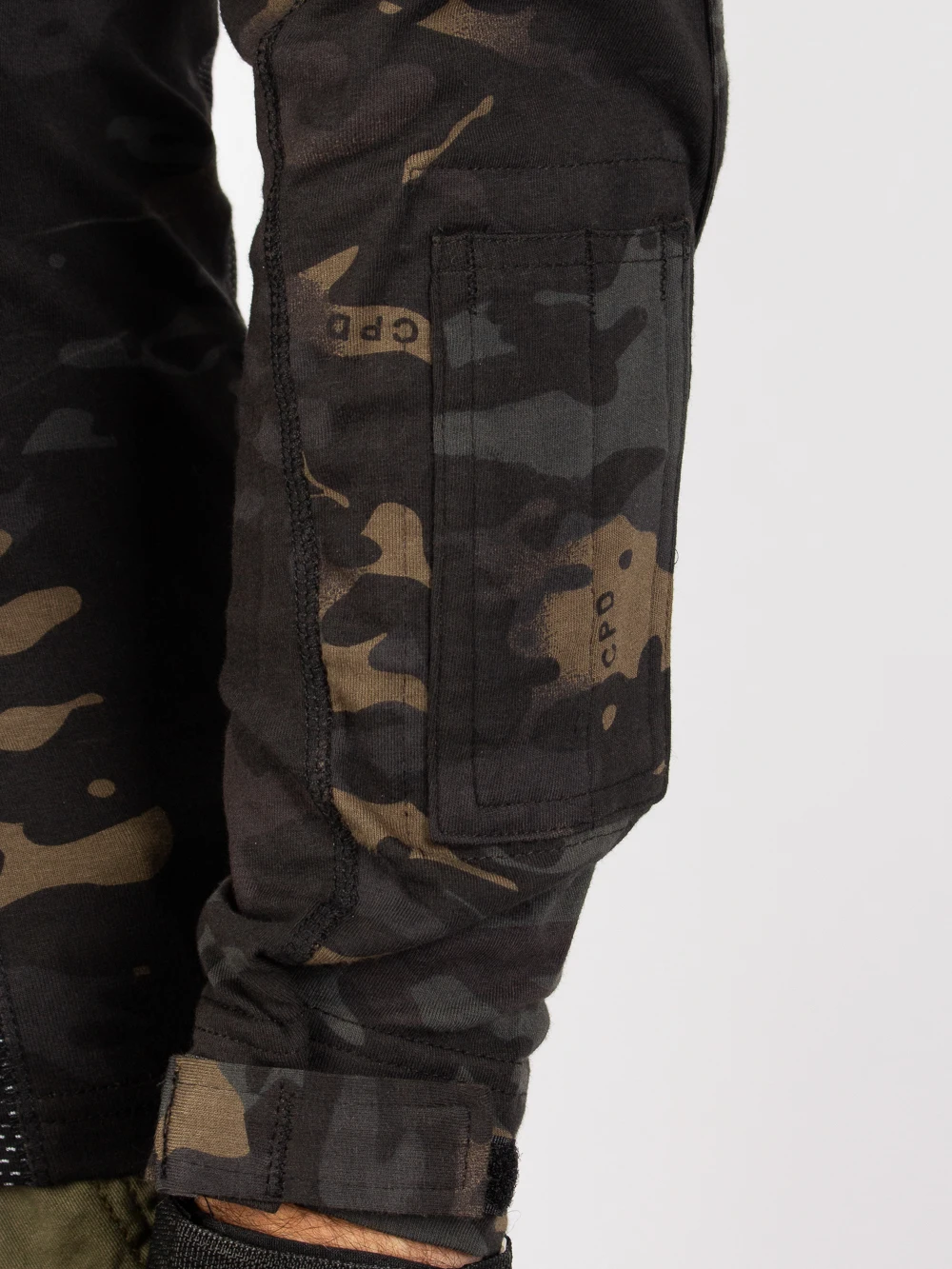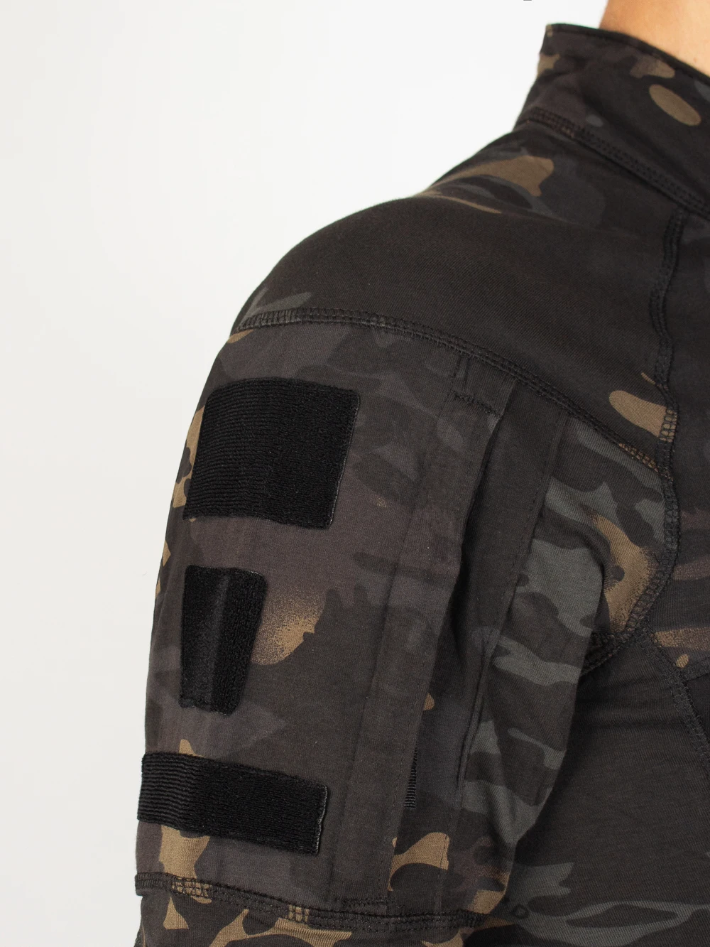 Рубашка без подклада сделана из смесовой ткани. Материал рукавов: 50% хлопок, 50% нейлон. Материал туловища: трикотаж (83% COOLMAX (полиэстер), 17% эластан). Усиление на локтях: накладка из ткани нейлон (100% полиэстер) с антиабразивным покрытием на основе ПВХ. Сезон: круглогодичный. Внимание! Данная рубашка не обладает огнестойкими свойствами (FR). Лучше всего рубашка походит для использования в жаркую погоду в комплексе с бронежилетом. Туловище выполнено из тонкого потоотводящего трикотажа и не имеет лишних мешающихся деталей (карманы и т.п.). Подразумевается плотная посадка по фигуре. Надевается через голову, носится в заправку. Туловище приталено, с запасом по длине, спина удлинена – не вылезает из брюк при активном движении Воротник-стойка на молнии, к затылку высота плавно увеличивается. Молния прикрыта изнутри по всей длине планкой с трикотажной подкладкой, сверху загибается наружу для защиты подбородка. Рукав реглан – на плечах отсутствуют швы, не стеснена свобода движения руками. Артикулированный по изгибу руки крой. Усиления локтей накладками выпуклой анатомической формы из ткани NYCO с нанесенным на ее поверхность антиабразивным покрытием на основе ПВХ в виде пупырышков. Пупырышки заметно увеличивают прочность ткани на истирание и препятствуют скольжению локтей при упоре в гладкие поверхности. На плечах карманы на вертикальной тракторной молнии. Карманы объемные, со складками внизу и сзади. Большие липучки для крепления шевронов. На дне обметанные петли для дренажа воды. Подмышками вставки большой площади из трикотажа для вентиляции и отвода пота. Манжеты с патами на липучках. На всех молниях удобные ухватки из тесьмы. Основные швы на трикотаже плоские защищают от натирания.