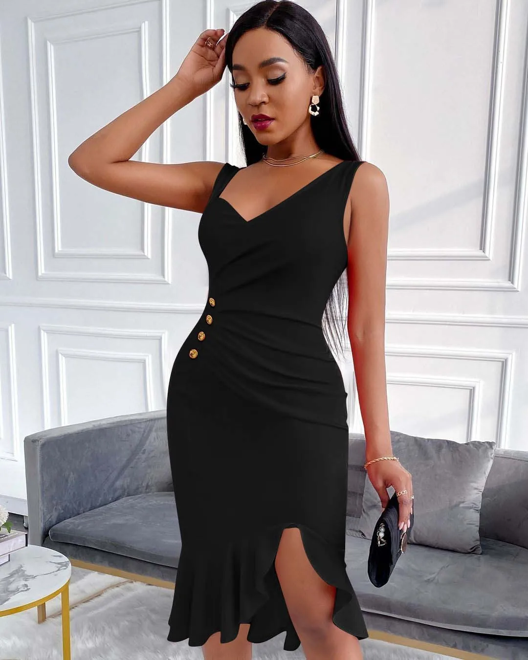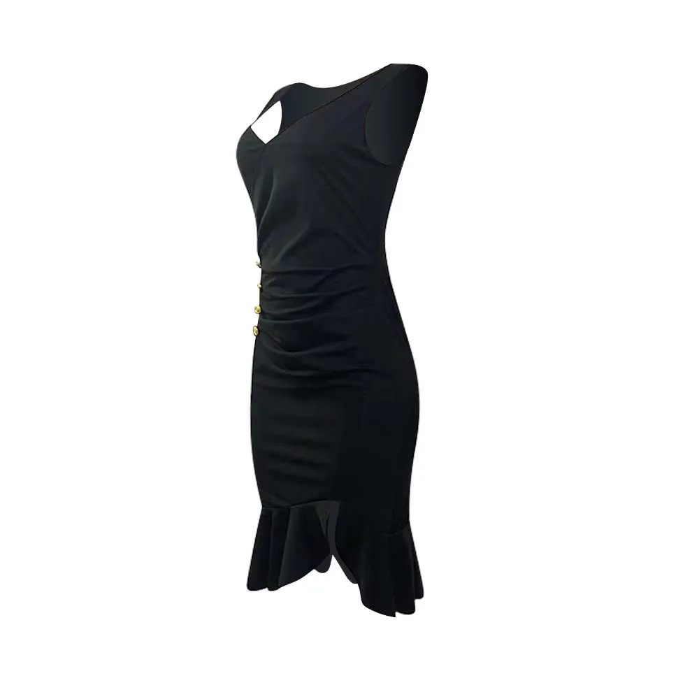 Черное пикантное платье с запахом приталенная юбка-годе на пуговицах красная