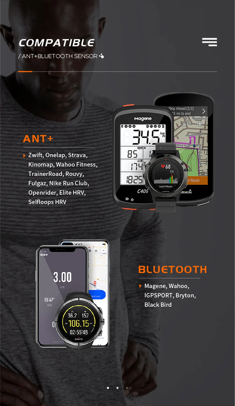 1. Двойная система передачи (ANT +/Bluetooth) совместима с широко используемыми смарт-устройствами ANT + и Bluetooth!