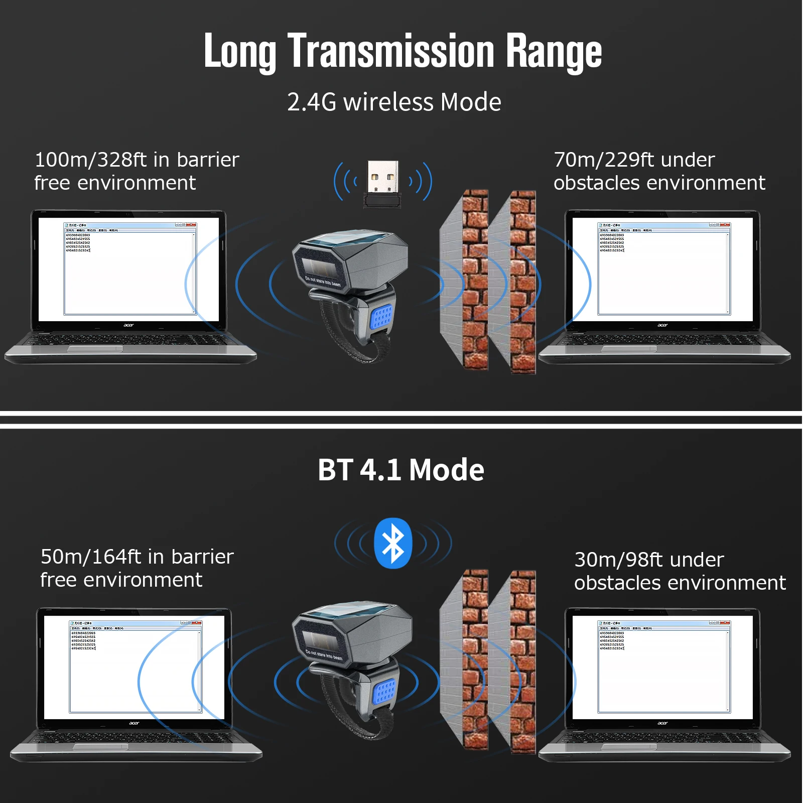 3 в 1 Режим подключения с Bluetooth и 2,4G беспроводной и USB проводной, наряду с мощными возможностями декодирования штрих-кода, быстрой скоростью сканирования и дальней передачей.