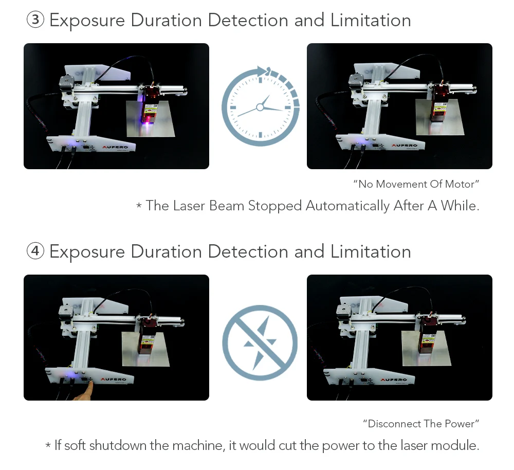 [Общая Оптимизация] Aufero имеет более длительный срок службы, потому что механическая структура была оптимизирована и разработана для высокой точности гравировки в течение длительного времени. В то же время, Aufero может предоставить пользователям больше безопасности, потому что он имеет больше функций безопасности.