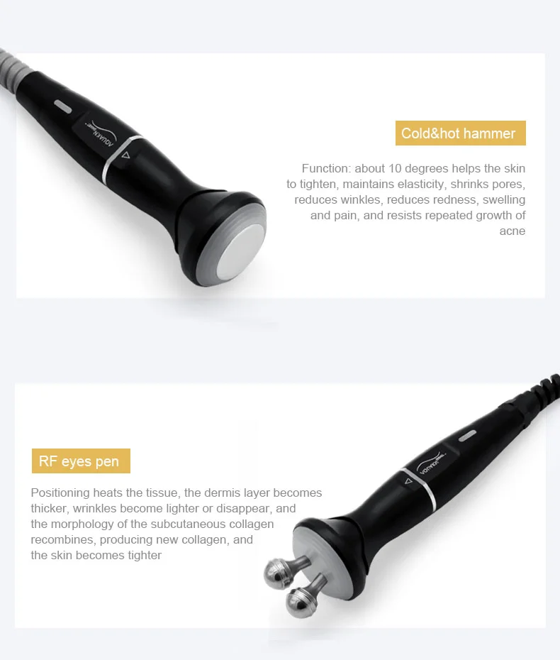 Aqua peeling head: First clean skin with aqua peeling handle, choose different solution according to skin situation. suck skin from middle to both sides. slide quickly. do not stay too long. For sensitive skin ,use flat tip and vortex tip, for large pores and T zone, use the tip with mattle surface Cool and warm hammer (forehead, face): 10 centigrade degree-- promotes skin tightening, keeps skin elasticity; shrink pores; wrinkle, skin’s redness, swelling and pain reduced; Anti repeated acne. 42 centigrade degree - helps to relax the muscles, stimulate and accelerate the blood circulation ; eliminates facial toxins, and blackheads, dirty when deep cleansing. Microcurrent contour head: Penetration into the human body 1MA micro current:infiltrate the active ingredients into the skin,remove dirt and cations from the skin,cross-stimulate the dermis layer,press the acupoints,and effectively realize the electric wave to enhance the skin tightening effect. Facial ultrasound(forehead, face): accelerates the essence nutrition absorbing, promotes the skin metabolism, Promotes cell activation; improves spotted wrinkles. Eyes RF (Eyes): Heating the skin tissue in the fixed position which makes the dermis thicker, while wrinkle will be gone or becoming lighter. Reorganization the dermis collagen structure to produce new collagen, makes the skin tighten. Eyes ultrasound(Eyes): Accelerating the essence absorbing. Promotes the eyes skin metabolism. Improves dark circle and wrinkle. Skin scrubber(Forehead, nose, face): Water atomization shortly by using the high ultrasound frequency vibration, delicately exfoliate the skin to achieve cleansing effect. Oxygen sprayer(Face): Spraying essence or toner evenly on face with 0.2Kpa pressure for skin rejuvenation and wrinkle removal.