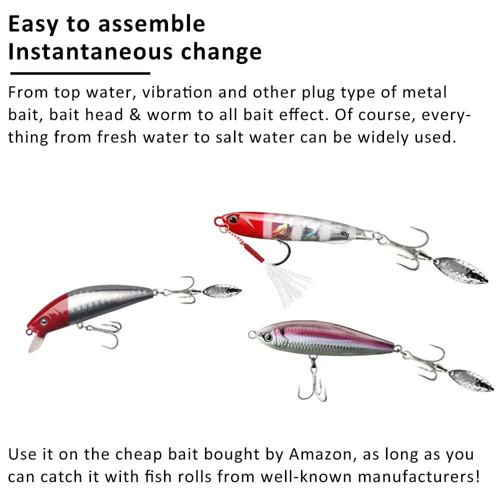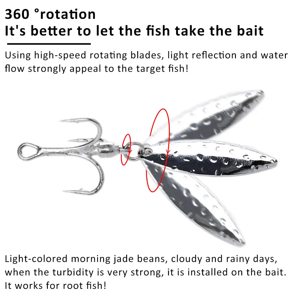 [Высокопрочное вращающееся лезвие] изготовлено из высококачественных металлических материалов, с металлическим блеском, коррозионной стойкостью и долговечностью. Дизайн рыбьей чешуи и реалистичные изображения облегчают ловлю рыбы, они будут производить отражения и необычный водный светильник для привлечения рыбы.
