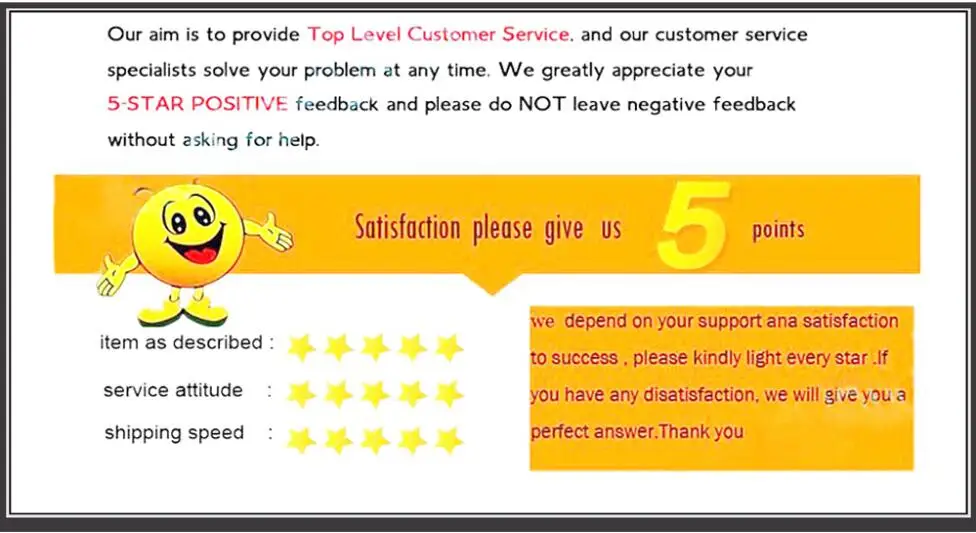 Уважаемый покупатель, если у вас есть какие-либо вопросы, пожалуйста, свяжитесь с нами. И мы ответим в течение 24 часов, кроме выходных. Если вы не удовлетворены нашим продуктом и обслуживанием, пожалуйста, свяжитесь с нами, прежде чем оставить отрицательный отзывы, тогда мы постараемся сделать все возможное, чтобы решить проблемы и сделать вас удовлетворенными.
