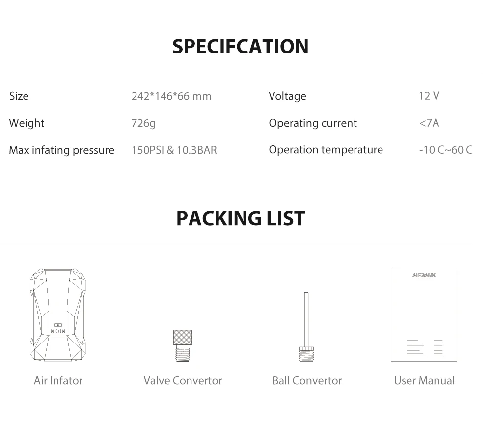 Warining: при использовании автомобильного прикуривателя в качестве источника питания, пожалуйста, сначала запустите автомобиль, а затем включите питание, чтобы предотвратить слив воздушного насоса автомобильного аккумулятора.