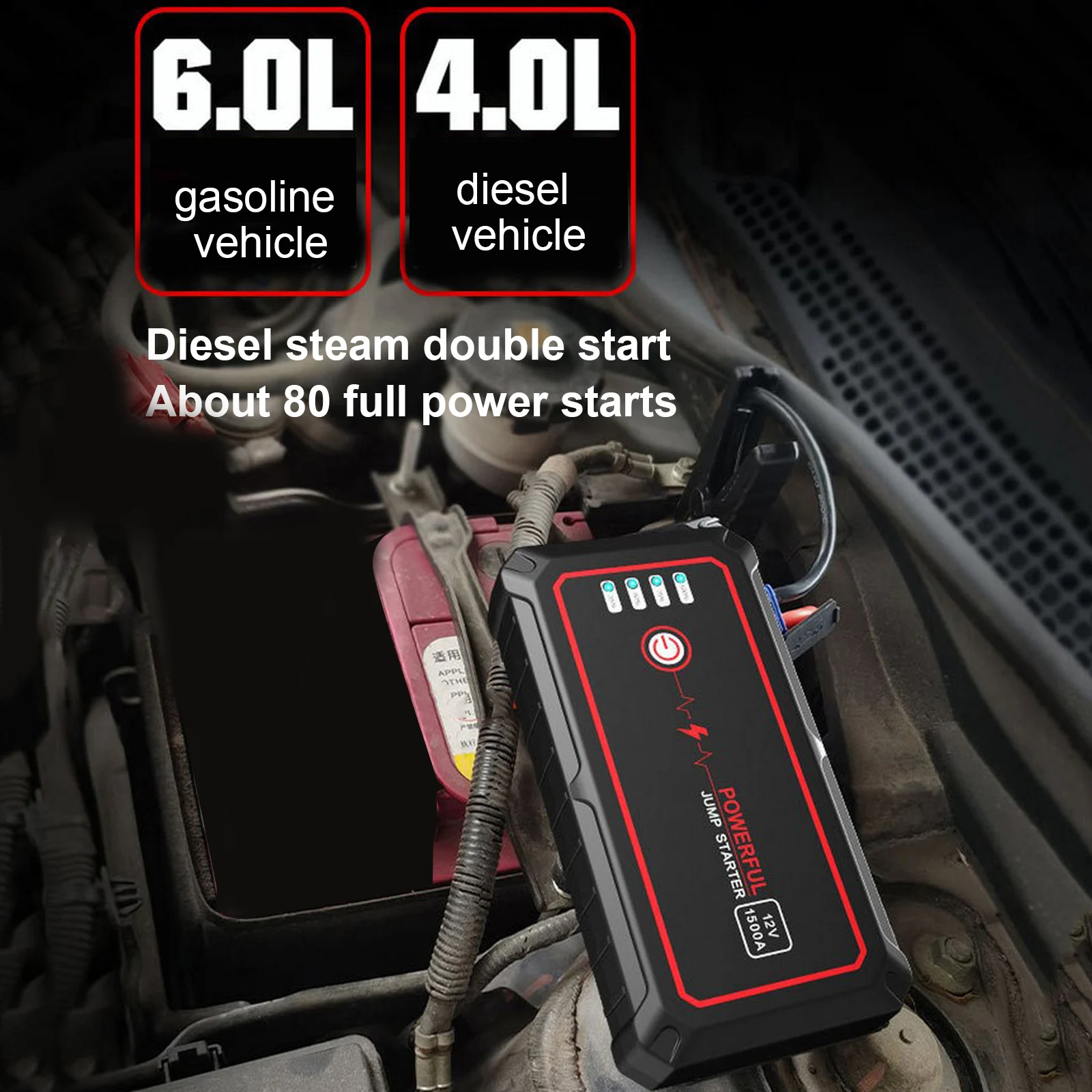 1,2021 новая производительность источника питания более сильная и стабильная. Фактический Стандартный пиковый ток составляет 1500а, можно безопасно начать в течение нескольких секунд, и он может быть запущен до 80 раз после одной зарядки. Подходит для 12 В (до 6,0 л бензина, 4. 0л дизельного двигателя) транспортных средств, внедорожников, грузовиков или фургонов.