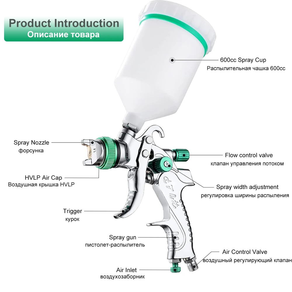 Своего рода. Точные иглы из нержавеющей стали и группы сопла подходят для различных покрытий. Он предназначен для обеспечения равномерного распыления и размера частиц для различных поверхностных покрытий. C. Сохраните краску и Обеспечьте лучшую производительность. D. Специальная коническая воздушная крышка может предотвратить брызги краски. Е. Регулируемая жидкость, режим и контроль воздуха для лучшей производительности. F. Сетчатый фильтр удаляет частицы грязи в краске и предотвращает дефекты. G. Медный клапан имеет хорошую герметичность. H. Корпус из алюминиевого сплава, хромированный, легко чистится и долговечен. Поколение. Игла и насадка из нержавеющей стали совместимы с краской на водной основе. J. Чашка из ПВХ 600cc может проверить уровень краски и легко чистить.
