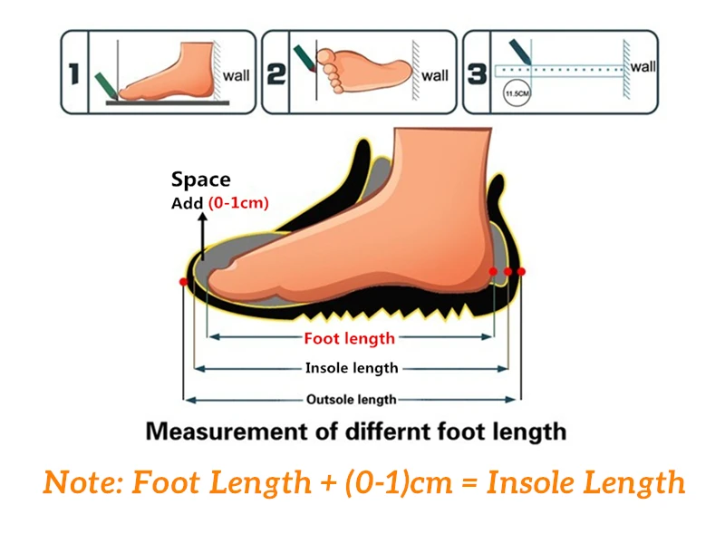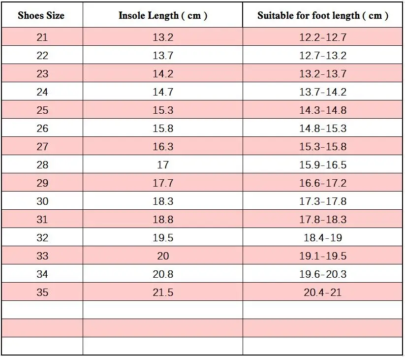 ● The comfortable length is the foot length add about 0.5-1cm. For example: Size 22, insole length is 13.7cm, suitable for foot length of 12.7-13.2cm.