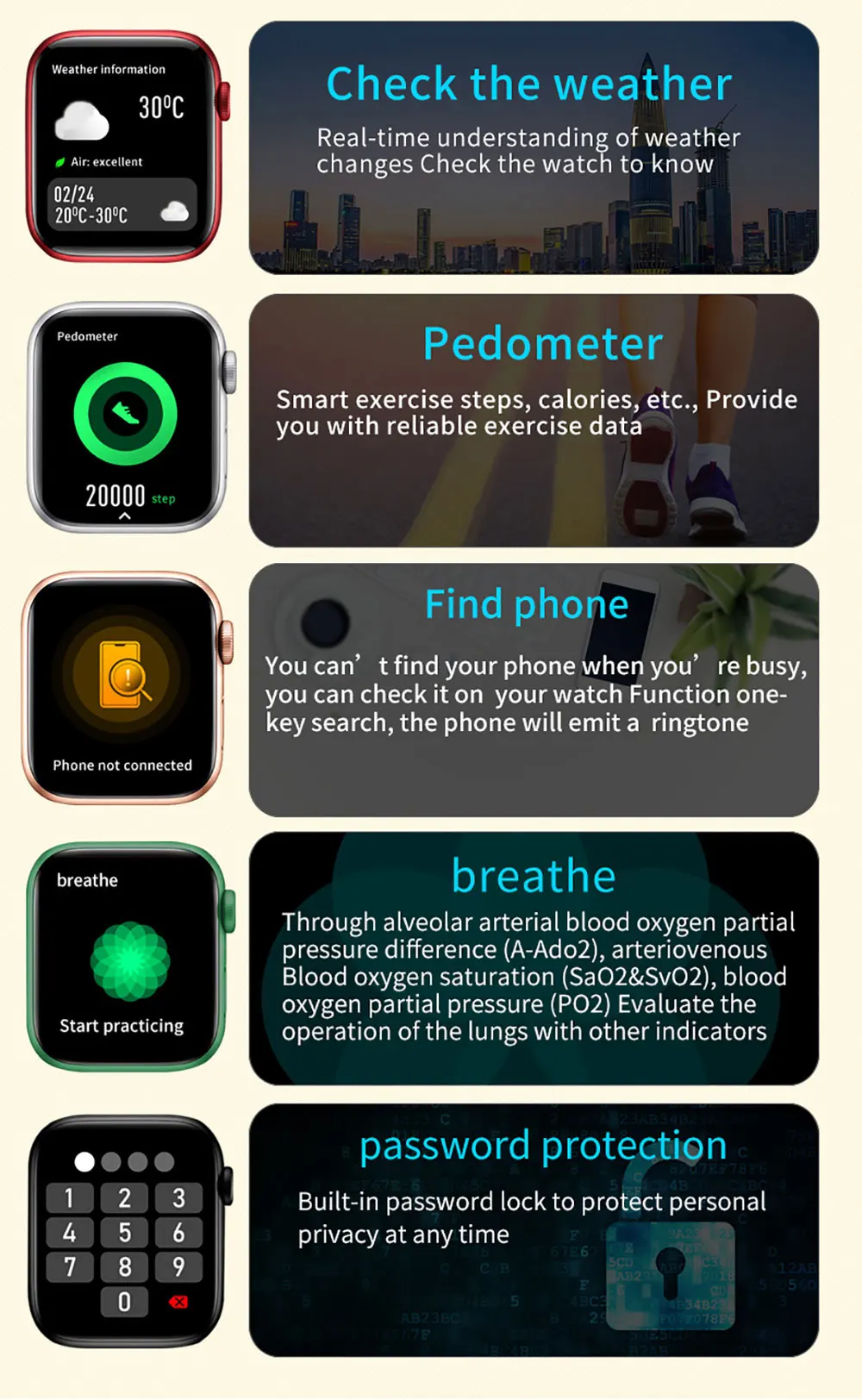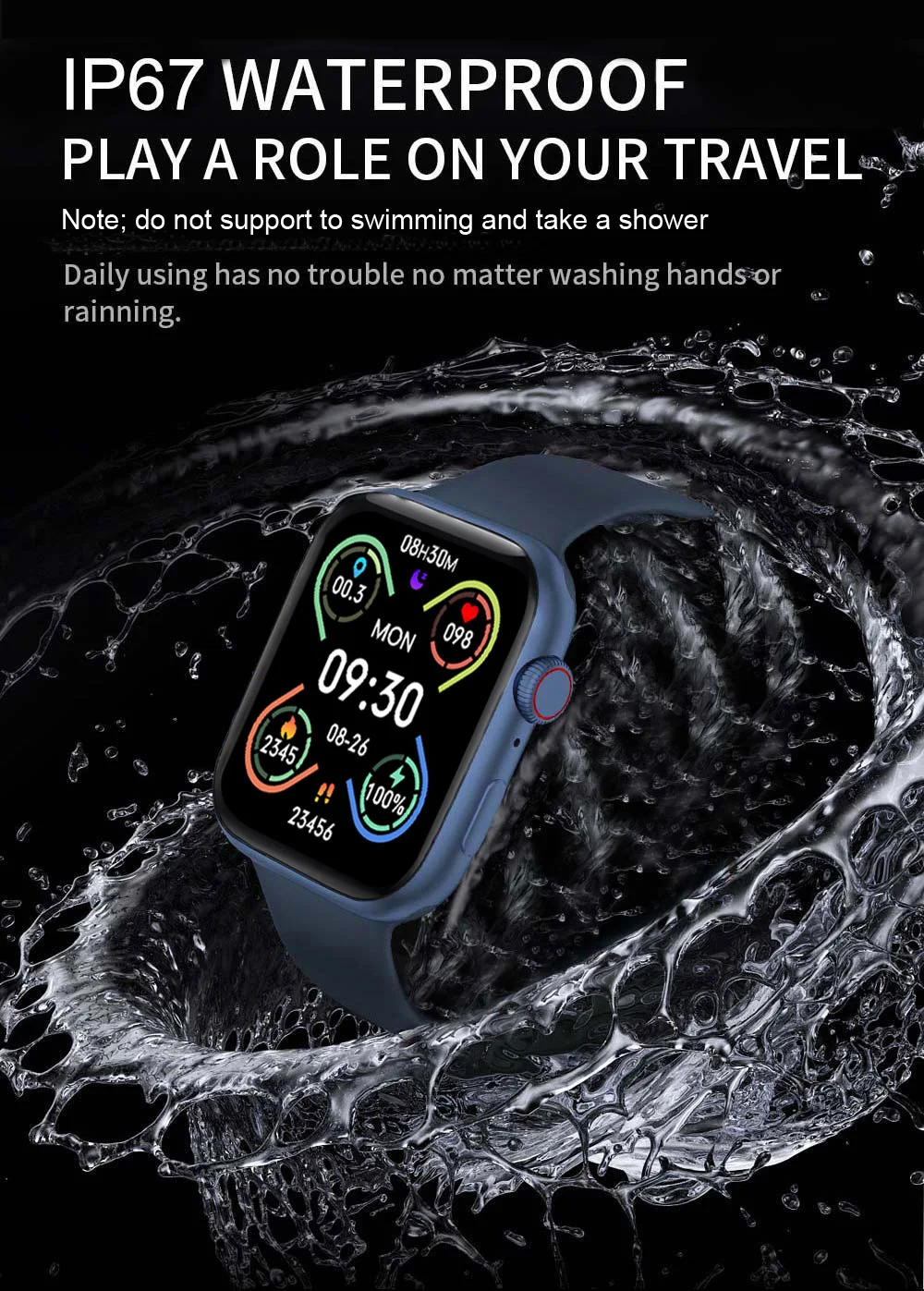 ---- Часы водонепроницаемы IP67. Это может предотвратить только пот и дождь. Вы не можете плавать или купаться с часами. Часы не должны подвергать воздействию горячей воды.