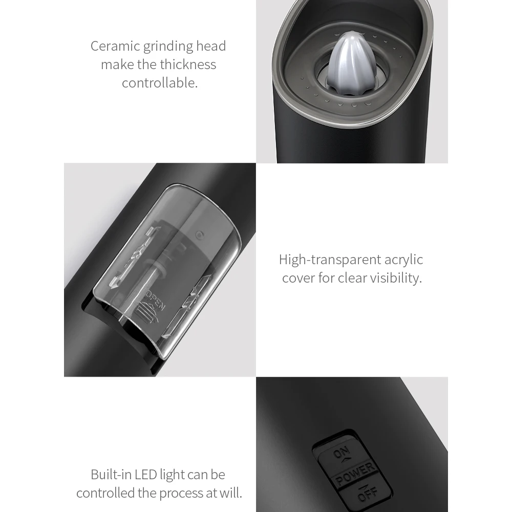 The electric grinder is suitable for pepper, salt and other solid grain seasonings. Battery powered, convenient and fast, you can use it anytime and anywhere. You can adjust the grinding knob on the top of the device to choose the roughness of your favorite spice, salt or pepper(cannot grind coffee).