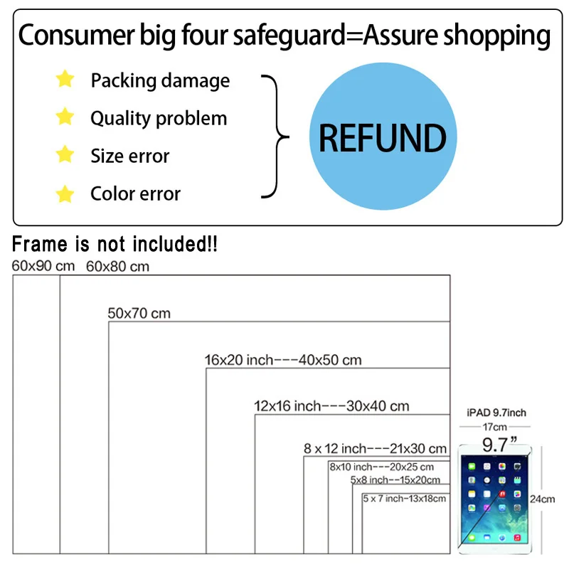 1. Размер, измеренный вручную, может иметь погрешность 0-5 мм. Наши декоративные картины не имеют белых краев. Если вам нужно оставить белую границу, пожалуйста, свяжитесь с нами перед оформлением заказа.