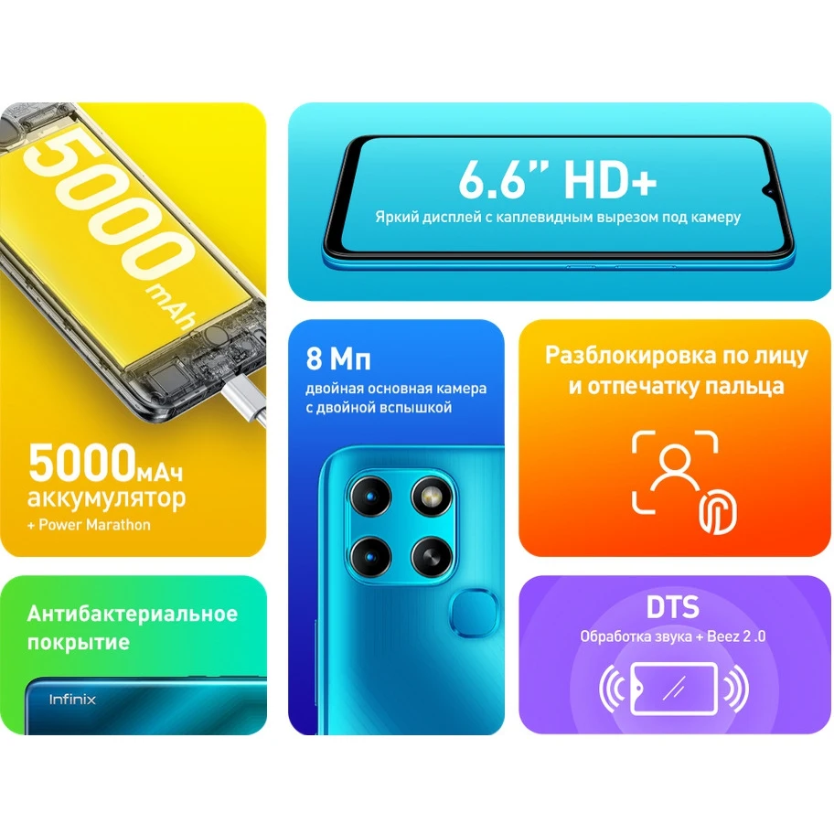 2хnanoSIM. Дисплей IPS, TFT, 6.6", 1600х720. Процессор Unisoc SC9863A, 8 ядер, до 1.6 ГГц. 8 Мп двойная основная камера. Фронтальная камера 5 Мп. Сканер отпечатка пальца. Антибактериальное покрытие. Аккумулятор 5000 мАч.