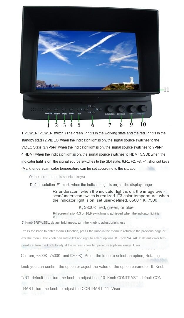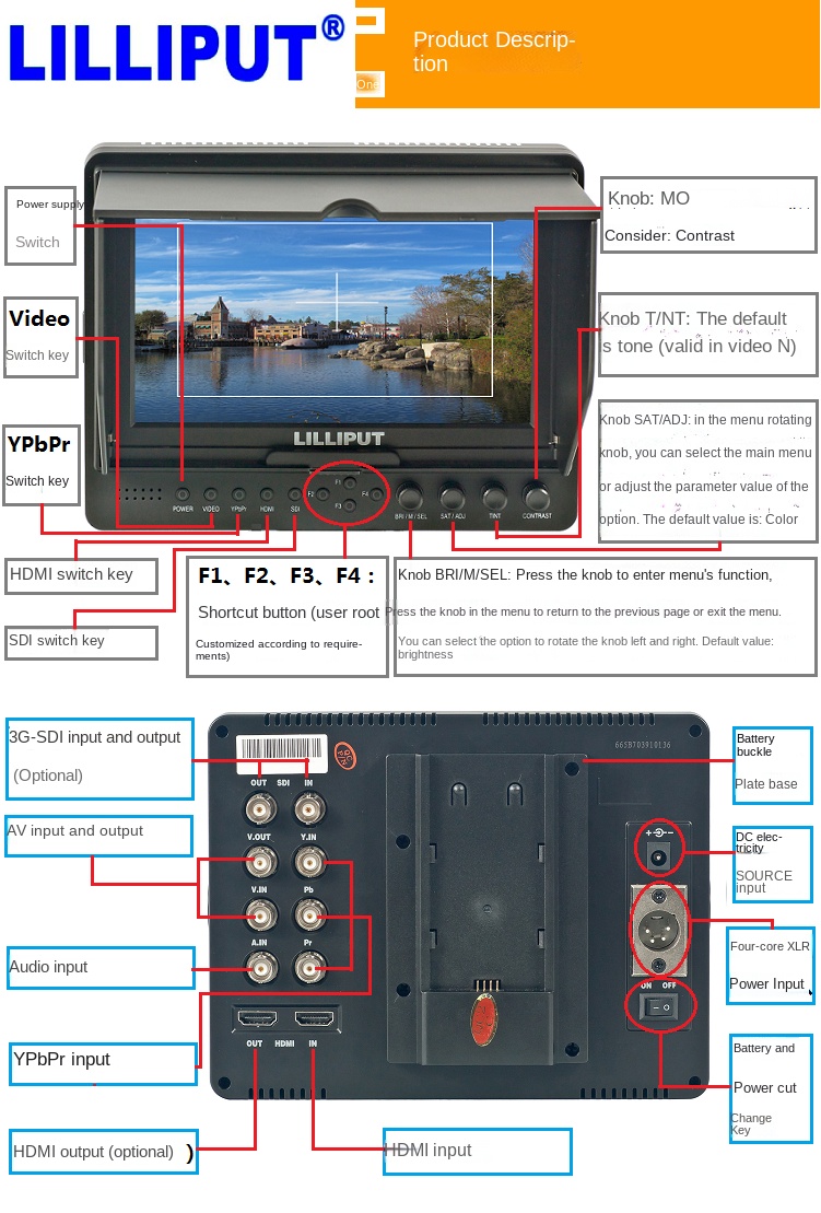 Маркер диапазона съемки, красный, зеленый и синий монохромный дисплей, переключение 16:9/4:3, underscan, переключатель overscan, HD-SDI, HDMI и видеовыход;