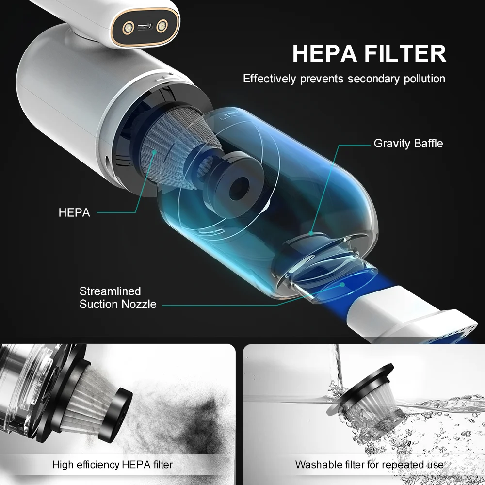 <Сильное всасывание>: С мощностью 8000 ПА вы можете сосать пыль, крошку хлеба, волосы домашних животных и практически любую грязь в вашем автомобиле, доме или офисе; моющийся фильтр HEPA можно повторно использовать и эффективно предотвращает вторичное загрязнение.