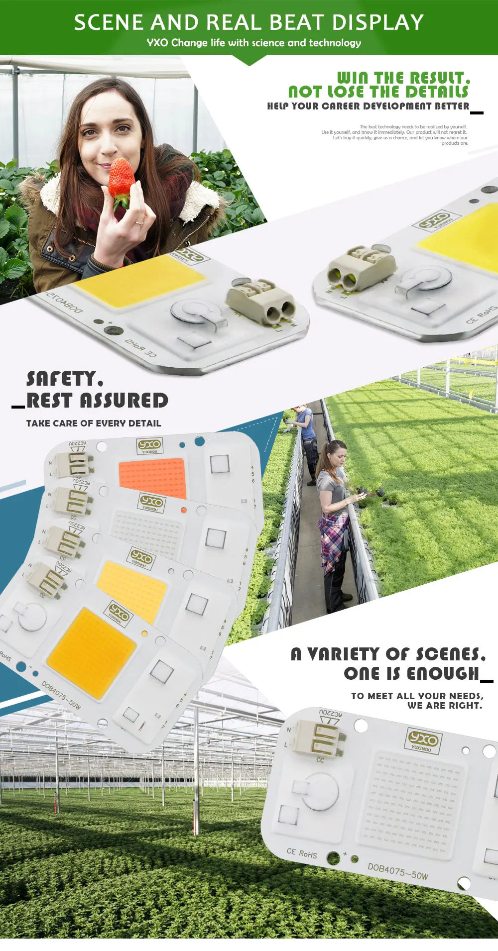 2. Цвет:Полный спектр380-780нм3.Фосфор: 660нм (другой поставщик использует 620нм, так что это дешево)4. Чип: Bridgelux5. Мощность: 20 Вт/30 Вт/50 Вт/80 Вт/100 Вт6. Входное напряжение:220V-265V7.Размер:75x40x1.6 мм/45x30x1мм8. Материал корпуса: алюминий/керамика9.Диммируемая:Да10. Срок службы от источника энергии:> 50000 часов11. Угол освещения: 12012. Гарантия: 3 года/5 лет13. Почему наш светодиодный чип лучше, чем другой чип, потому что это новая технология DOCB,Есть 12 функций для защиты светодиодных чипов длительный срок службы.