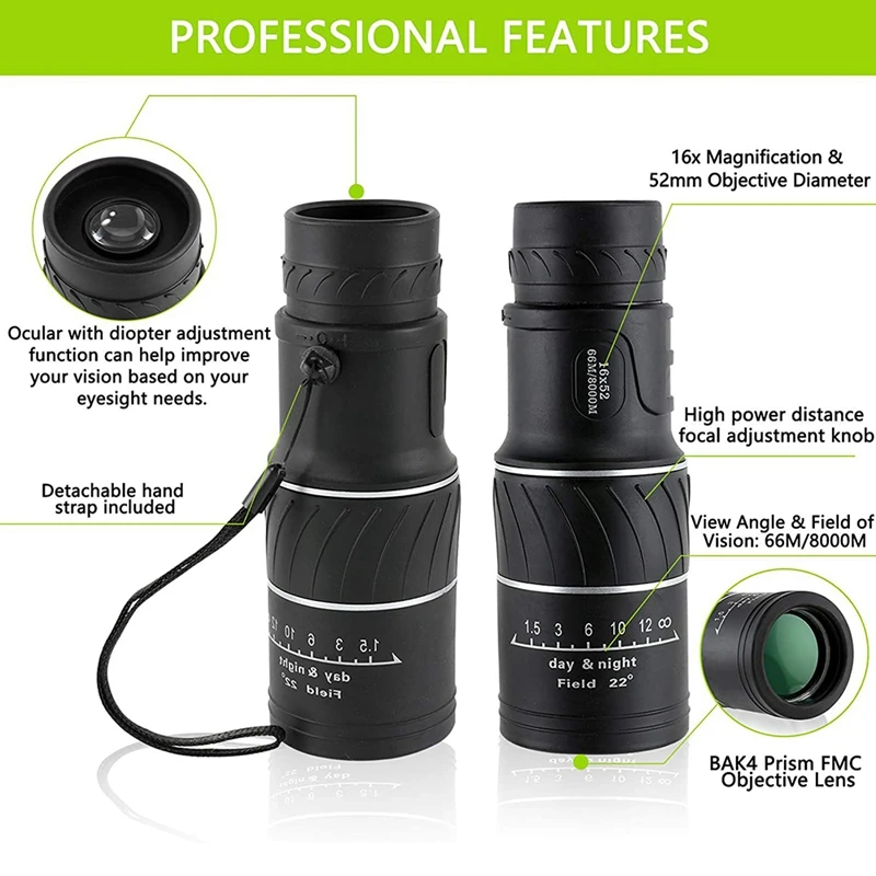 Monocular Telescope 16X52 Night Vision Telescope Optical Spyglass Monocle for Outdoor Camping Bird Watching Hunting