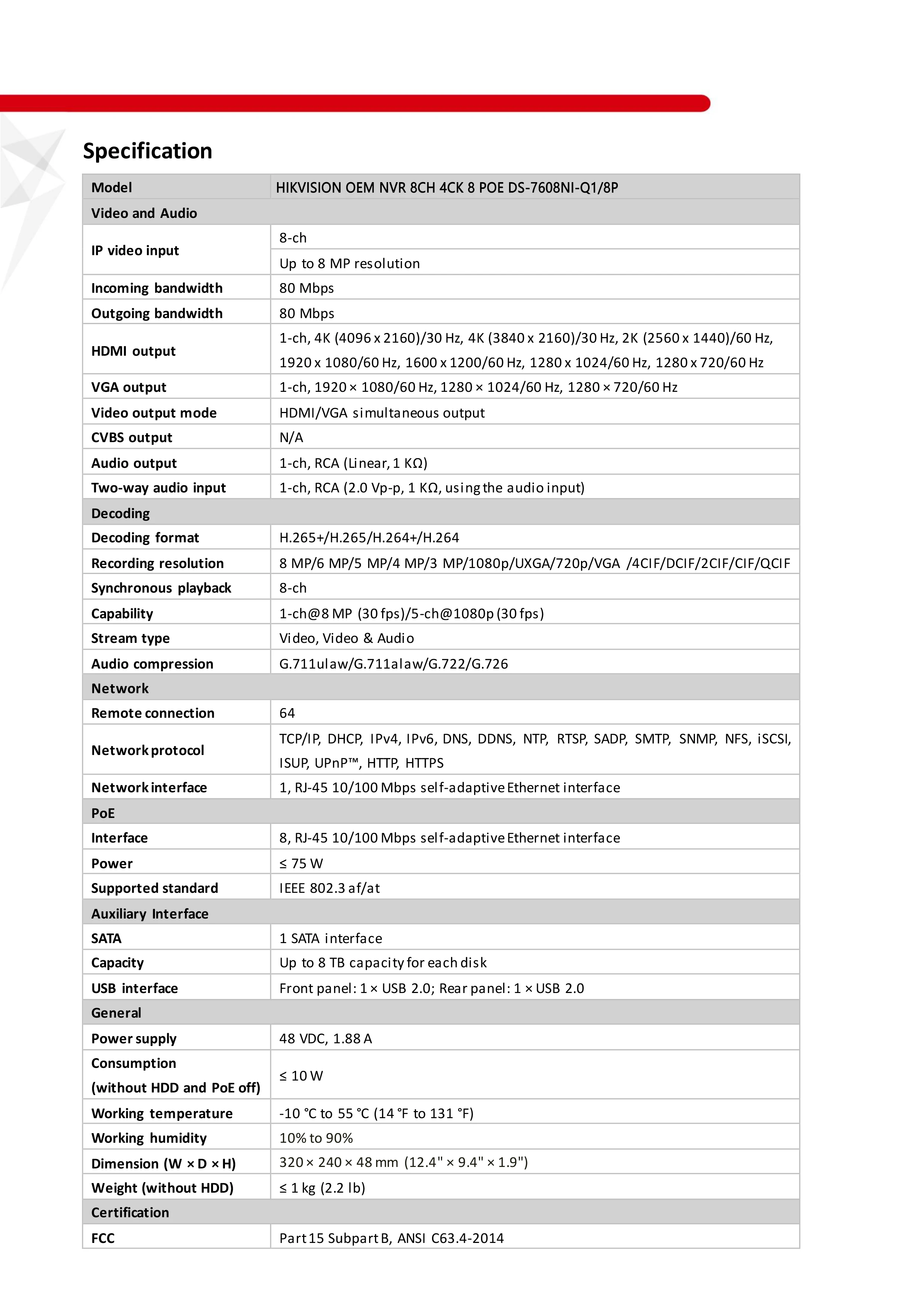 Этот NVR поддерживает максимальный выход 4K 8MP HDMI и выход VGA. Встроенный частный протокол Hikvision, может легко подключаться и воспроизводить с ip-камерой 5 Мп.