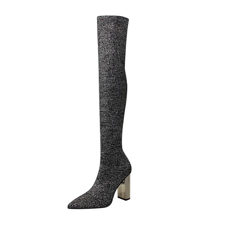 Женская обувь больших размеров женские высокие сапоги до колена пикантные Стрейчевые шерстяные сапоги на квадратном металлическом каблуке с острым носком 35-42