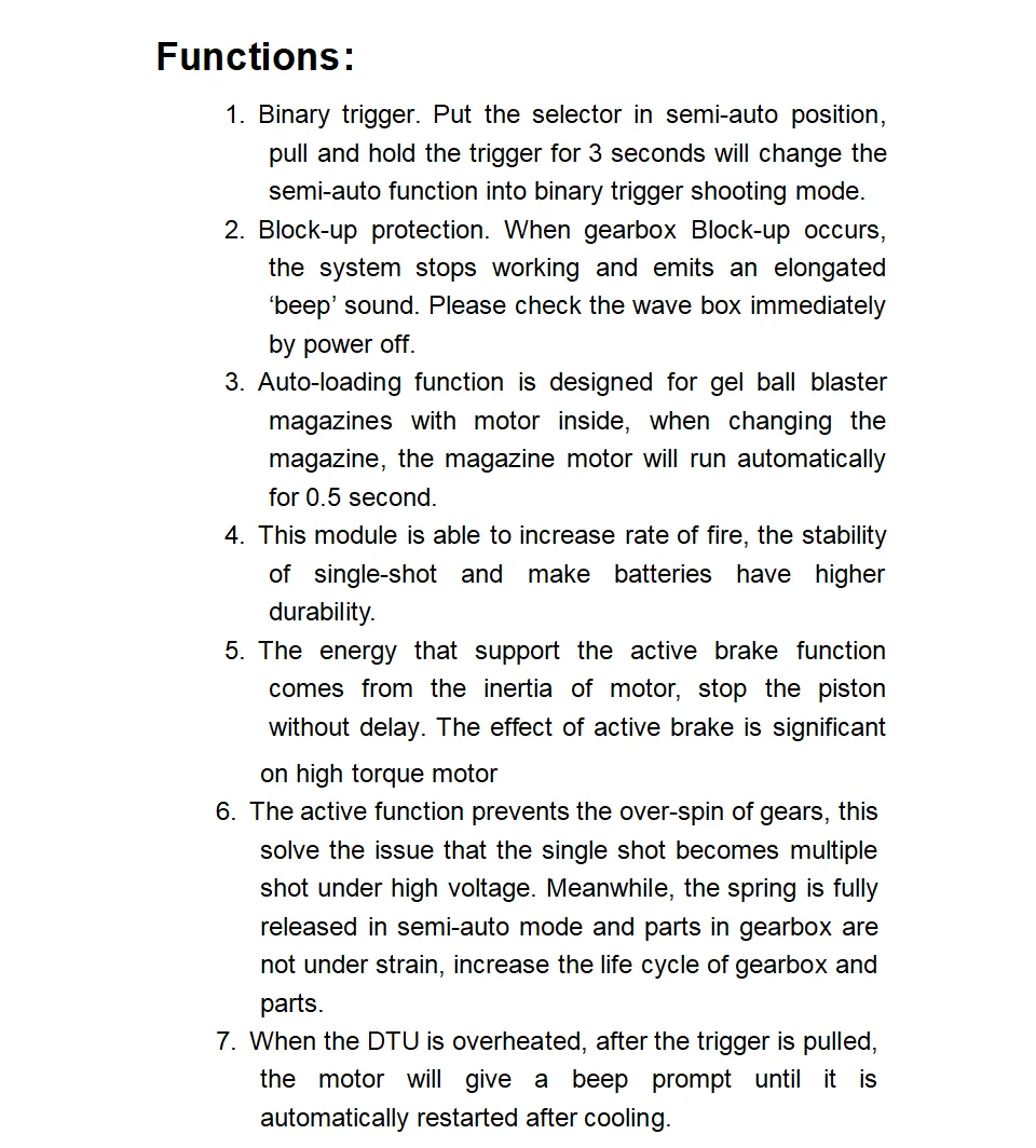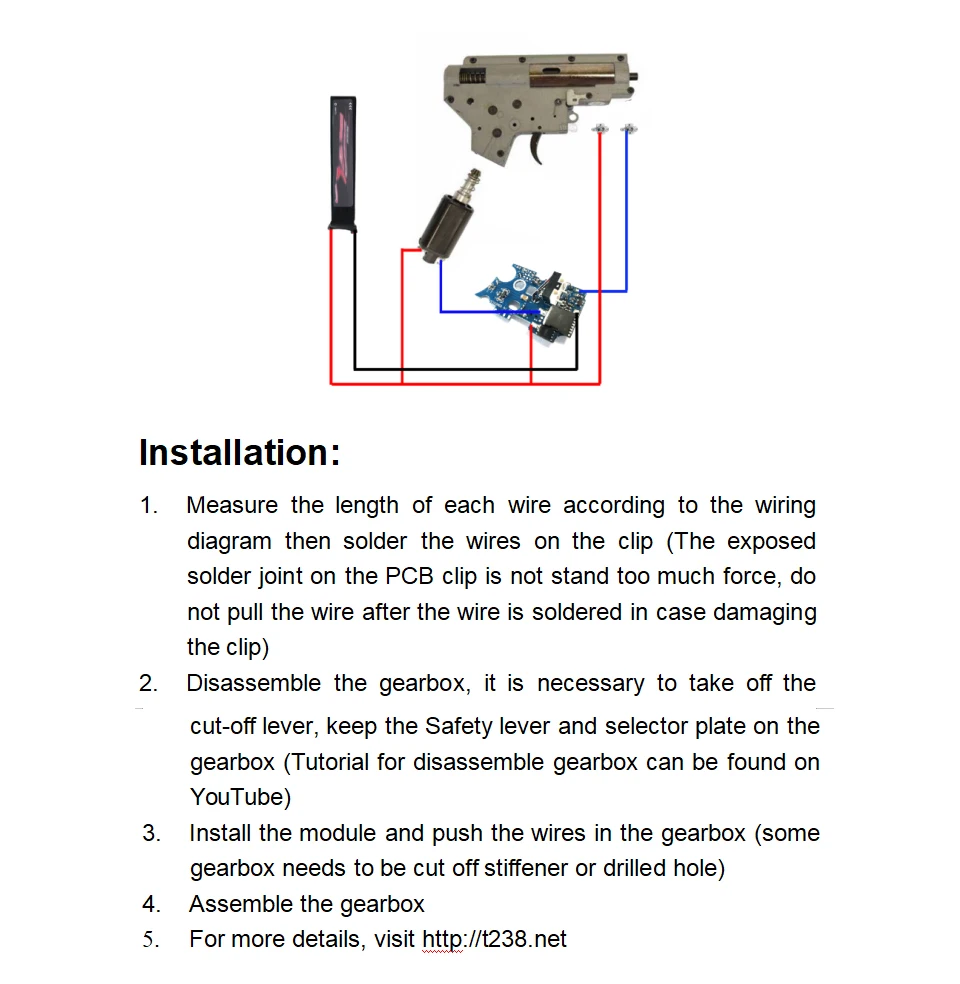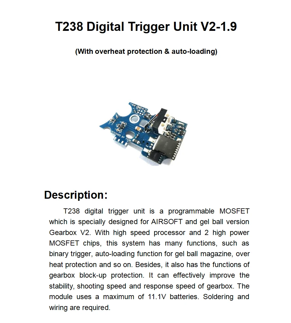 Цифровой триггер T238-это программируемый MOSFET, специально разработанный для страйкбола и геля, версия коробки передач V2. С высокоскоростным процессором и 2 мощными микросхемами MOSFET, эта система имеет множество функций, таких как асбинарный триггер, функция автоматической загрузки для журнала gel ball, защита от перегрева и так далее. Кроме того, он также имеет функции защиты блока передач. Он может эффективно улучшить стабильность, скорость съемки и скорость отклика коробки передач. Модуль использует максимум 11,1 V батареи. Требуется пайка и проводка.