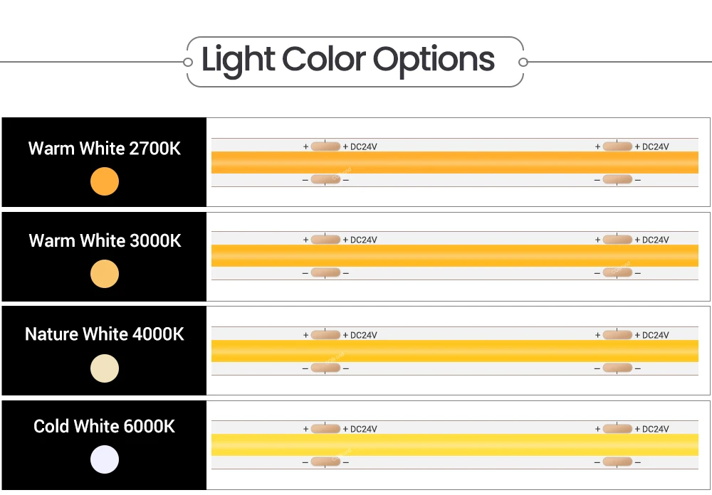 Цветовая температура: теплый белый (2700K/3000K), натуральный белый (4000K), холодный белый (6000K).