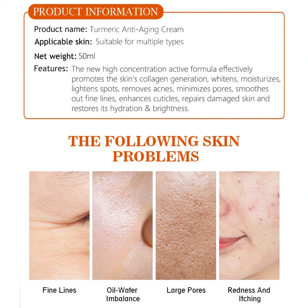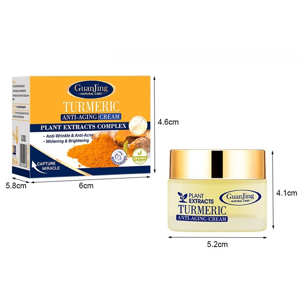 50ml Turmeric Face Cream Repair Acnes Scar Dark Spot Treatment Moisturizer Whitening Lightening Against Acne Skin Care Description: Product Name:Face Cream Type:Face Cream Applicable People:Universal Suitable skin type: All type of skin Shelf life: 3 years Net content: 50ml Gross weight: 200g Product Size:6*5.8*4.6cm Main Ingredient: 1. Turmeric Extract: It has stronger anti-oxidation ability and strong sterilization and sterilization ability. 2. Glycerin: Lock the moisture in the skin and reduce the loss of moisture. 3. Aloe extract: Has moisturizing, anti-itch, and anti- allergic effects. 4. Chrysanthellum Indicum Extract: Can enhance the activity of the skin, has anti-oxidation and anti- aging effects. Features: The new high concentration active formula effectively promotes the skin's collagen generation, whitens, moisturizes, lightens spots, removes acnes, minimizes pores, smoothes out fine lines, enhances cuticles, repairs damaged skin and restores its hydration & brightness. Package Include: 1 x Face Cream Notes: 1. Due to the difference between different monitors, the pictures may not reflect the actual color of the item. 2. Compare the detail sizes with yours, please allow 1-3cm error, due to manual measurement. 3. Please leaving a message before you give the bad feedback, if the products have some problems. Thanks for your understandings.