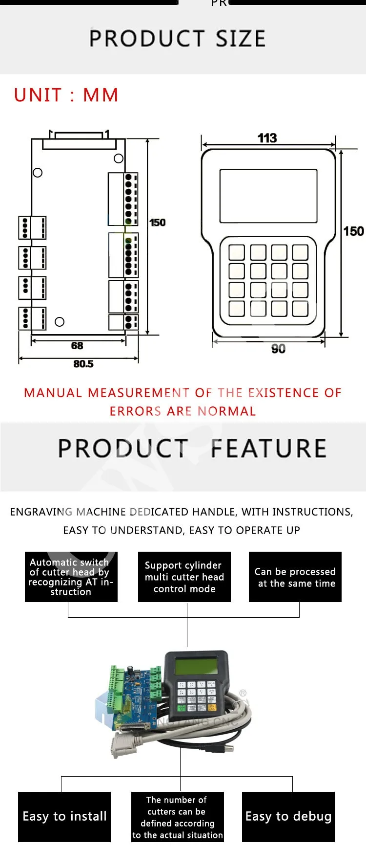 1. Полностью независим от платформы ПК;2. Непосредственно считывает файлы с u-диска;3. Легко обрабатывать G код или PLT файл с супер размером;4. Сильная система и функция обработки файлов;5. Легко обновляется системная программа;6. Он поддерживает высокий микро шаг, который делает точный и быстрый процесс возможен;7. Поддержка обработки части файла;8. Надежная защита данных и функция восстановления;9. Дружественный рабочий интерфейсМеры предосторожности1. Не используйте этот продукт в сильной магнитной или мешательной среде;2. Не используйте PnP U диск во время запуска файла;3. Защищает от воды, влаги, пыли и огня;4. Защищает его от попадания металлических материалов в крышку;5. Forbad, чтобы открыть крышку, нет никаких пользовательских ремонтопригодных частей внутри;6. Подключите U диск и другие линии.Смотрите так же другие товары: