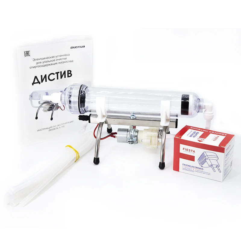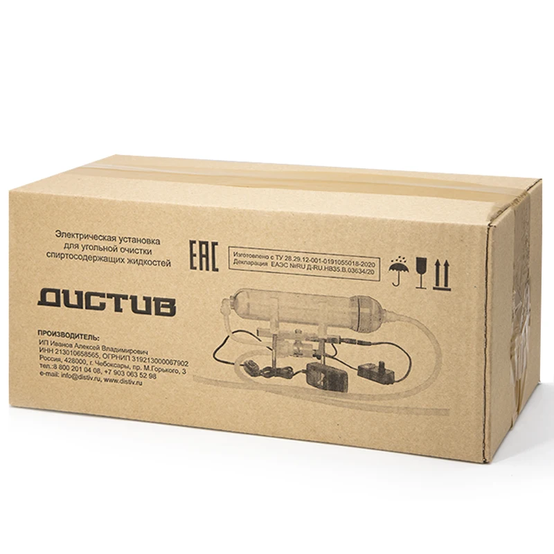 Электрическая установка ДИСТИВ состоит из прозрачной колбы для засыпки фильтрующего состава с фильтр-шайбой из вспененного пенополиуретана, мембранной помпы, блока питания, с кнопкой включения /выключения, силиконовых шлангов, металлического каркаса из пищевой нержавеющей стали. Соединения колбы выполнены на быстросъемных фитингах.