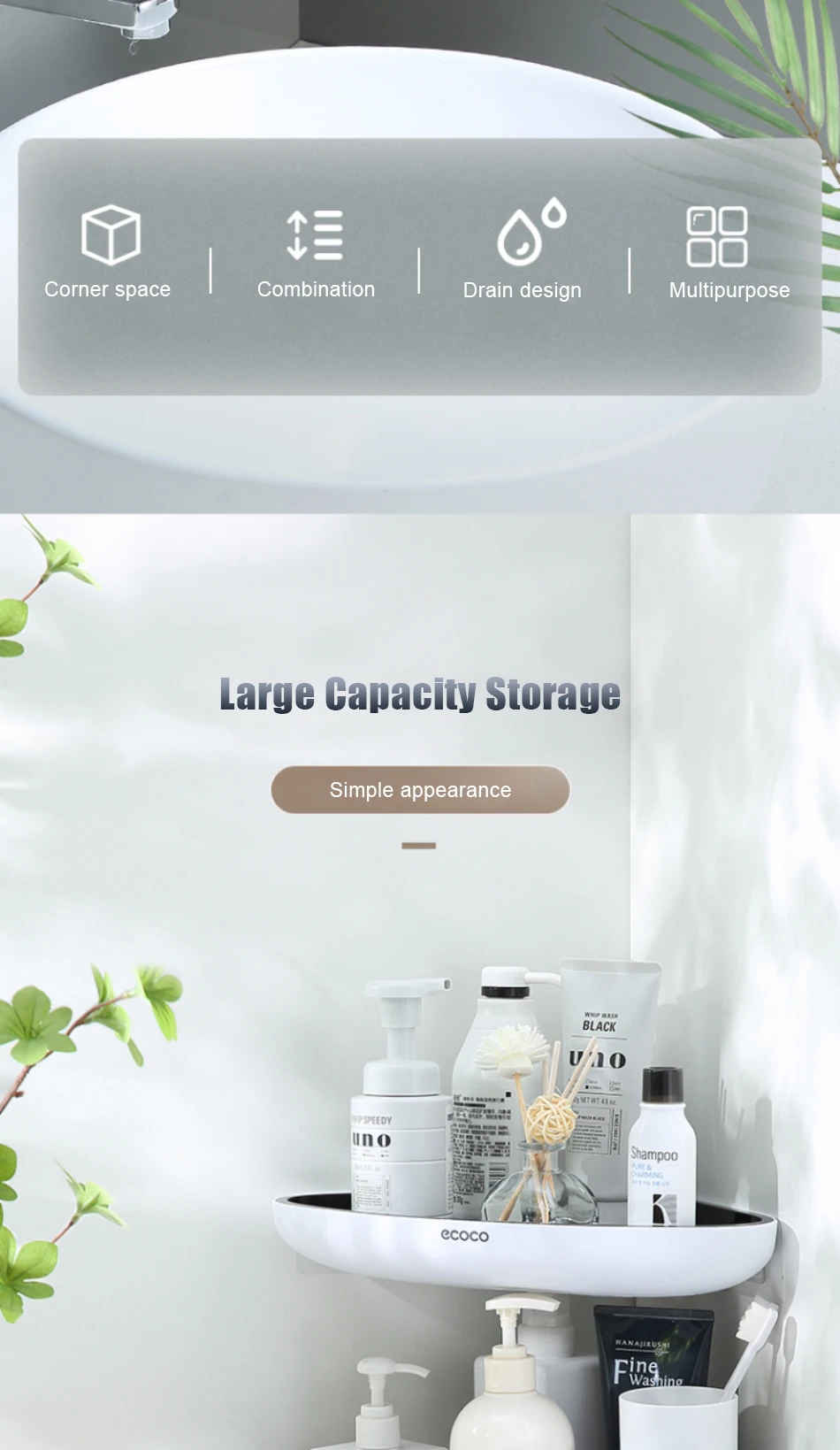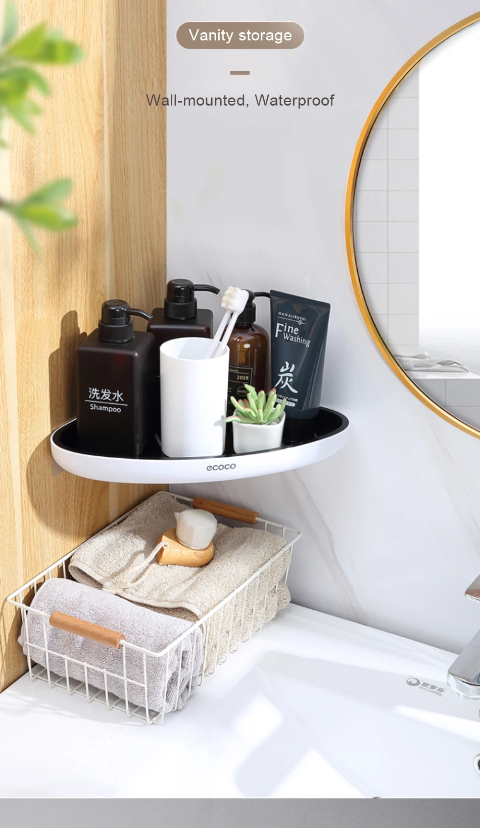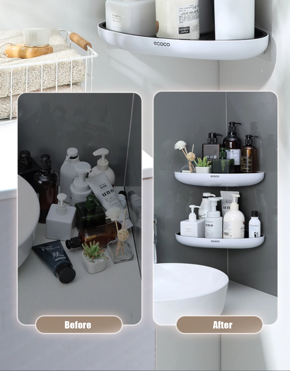 1. Не требующая перфорации настенная угловая стойка для хранения в ванной комнате, рациональное использование пространства.