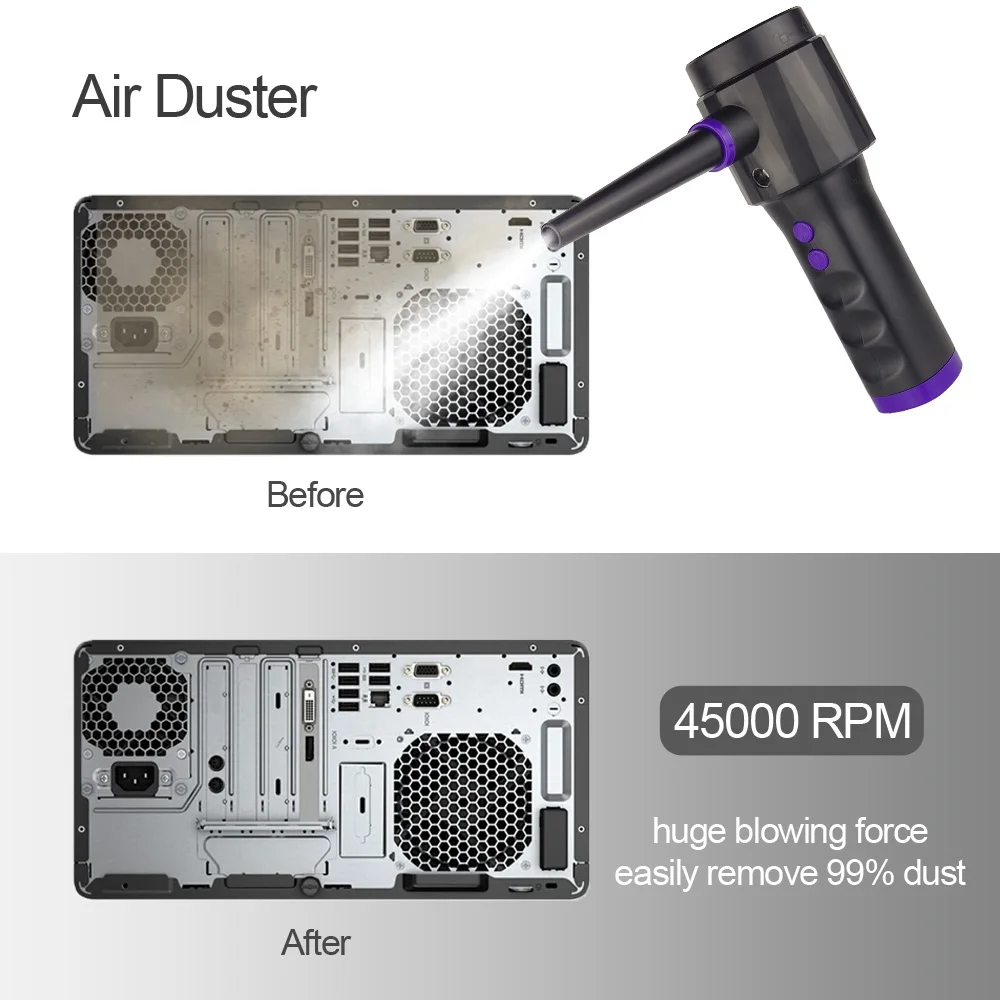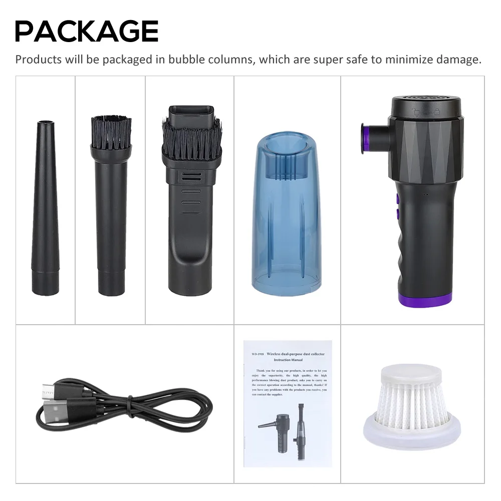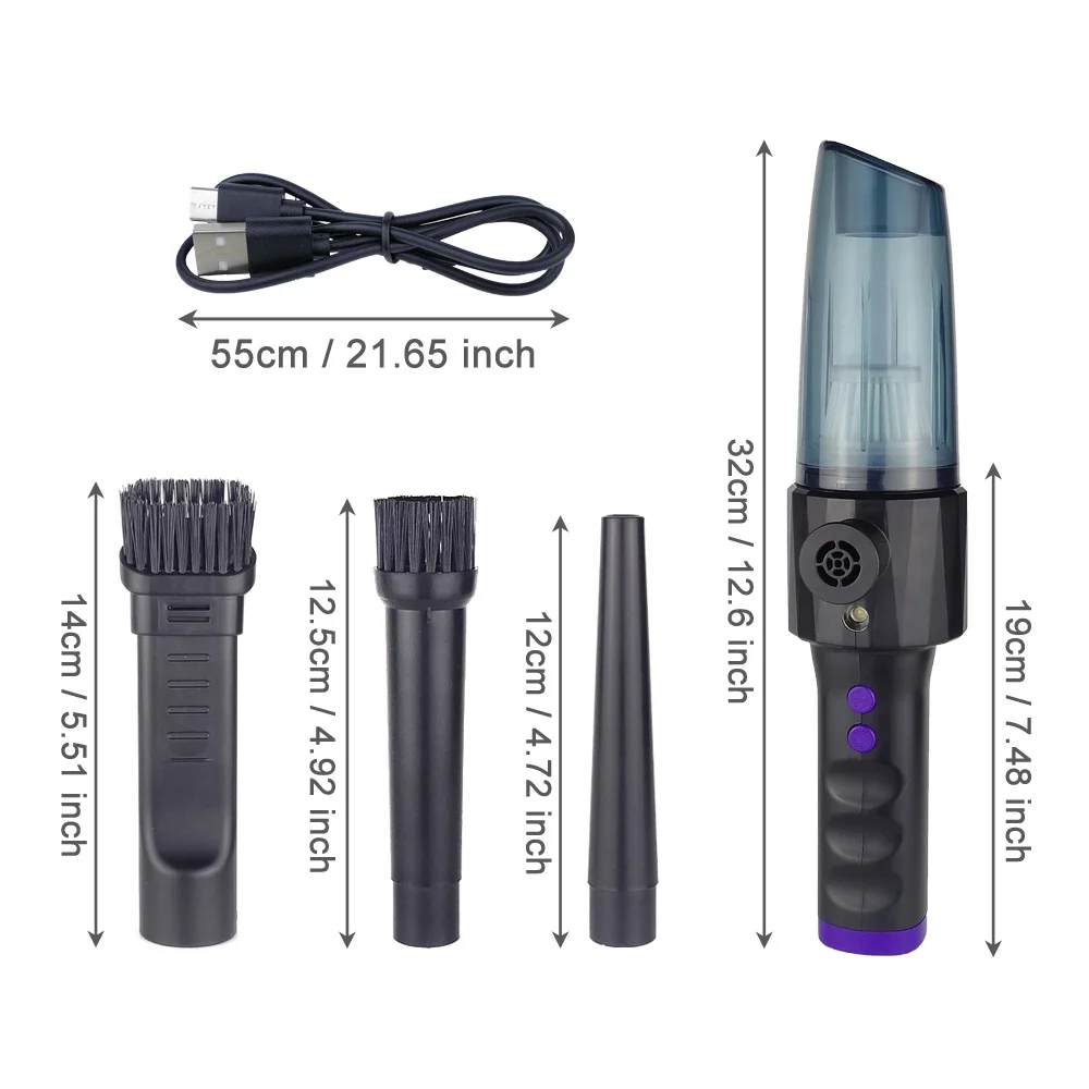 Чтобы очистить клавиатуру ПК, вентиляционное отверстие автомобиля, решетку кондиционера, достаточно режима вентилятора; Для крошки или рассеивания пыли на поверхности стола, автомобильного сиденья, дивана, или углы любого места, Вакуумный режим помогает тщательно высасывать их! Чехол, который частицы скрывают глубоко внутри пушистого материала, сначала выдувают, чтобы Маленькие фрагменты текли на поверхность, а затем легко высасывают их.