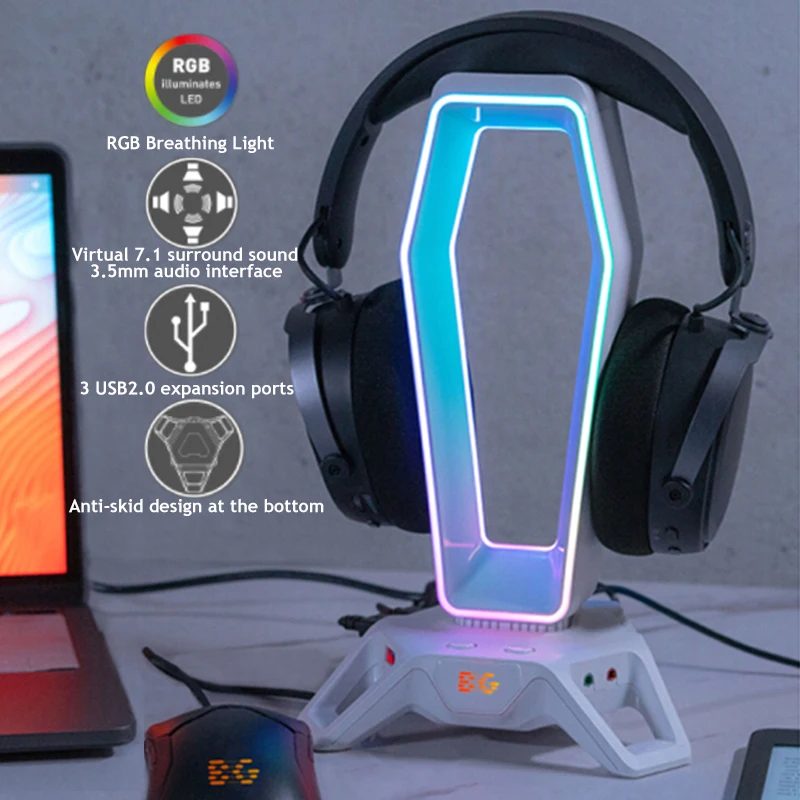 RGB гарнитура Стенд Многофункциональный держатель для наушников вешалка дисплей полка с 3 USB 2,0/Виртуальный 7,1 объемный звук 3,5 мм аудио порт 1. Функциональный интерфейс расширенияБаза оснащена 3 портами USB2.0, которые можно напрямую подключить к оборудованию, что значительно повышает эффективность использования. 2. Объемный звук виртуального 7,1Встроенная звуковая карта с аудиоинтерфейсом 3,5 мм, поддерживающим объемный звук virtual 7,1. 3. Красочный стример RGBМодуль светового эффекта может быть установлен с 4 видами стримеров или 7 видов монохроматического отображения светового эффекта красного, зеленого, синего, фиолетового, желтого, небесно-голубого и белого.Световой эффект может быть установлен в выключенном состоянии 4. 3 режима звукового эффектаНезависимая акустическая полость/стабильный звуковой эффект и чистый звук.Игровой режим/Hi-Fi режим/Режим кино 5. Тело машины только принимает пространство-времени туннельный дизайн,Подошва не скользит, устойчива и надежна, а внешний вид гладкий и нежный. Информация о продукте Размер продукта: 156*161*261 ммПорт: USB-A2.0 * 3Вес изделия: 408,5 гЗарядный кабель: 1,5 м Упаковочный лист: 1 * Подставка для наушников (Без розничной коробки)!