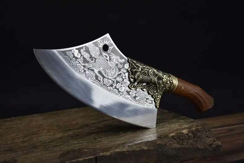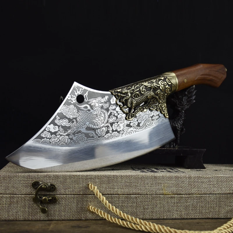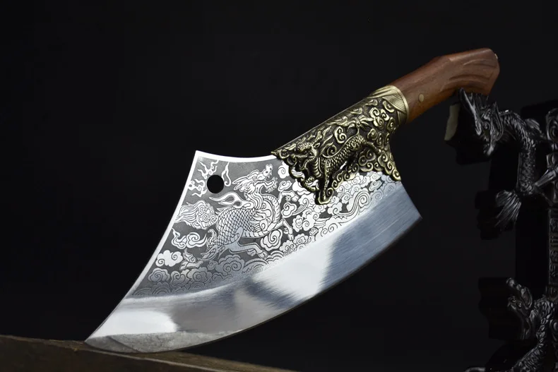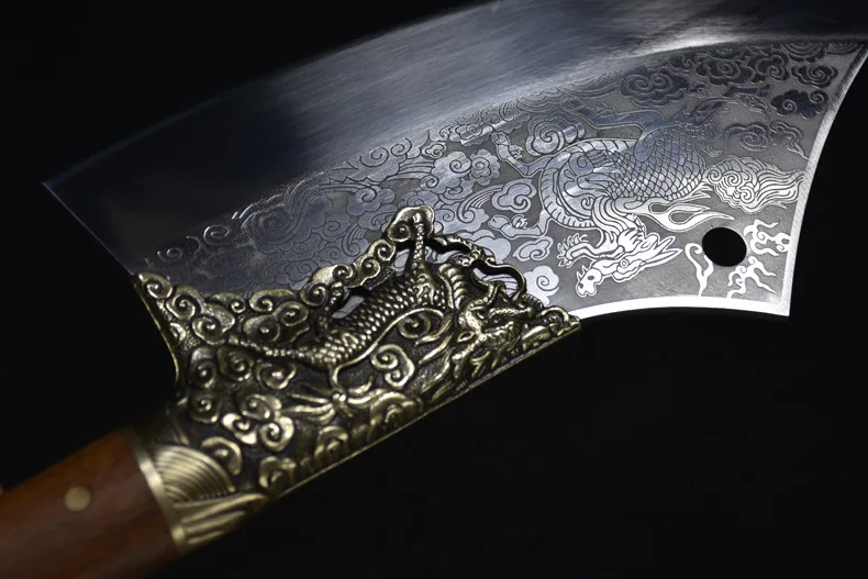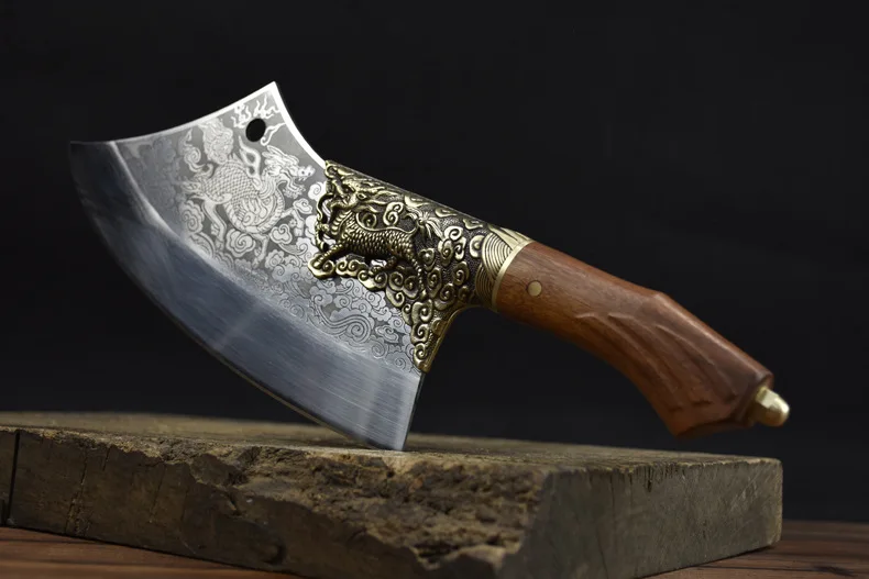 Характеристика: Мы используем вакуумную термообработку и холодную азотную обработку до 56 + HRC, обеспечивая прочность, гибкость и долговечность лезвия. При ошеломлении 14-16 ° двойные конические лезвия, которые обеспечивают острые режущие края бритвы. Ergonimic Rosewood ручка обеспечивает нескользящий и удобный захват. (Не используйте его для резки больших костей,Замороженное мясо или твердая еда). Это наиболее часто используемый нож в Китае, Широкое лезвие может легко лопатой для переноса пищи из разделочной доски в горшок.