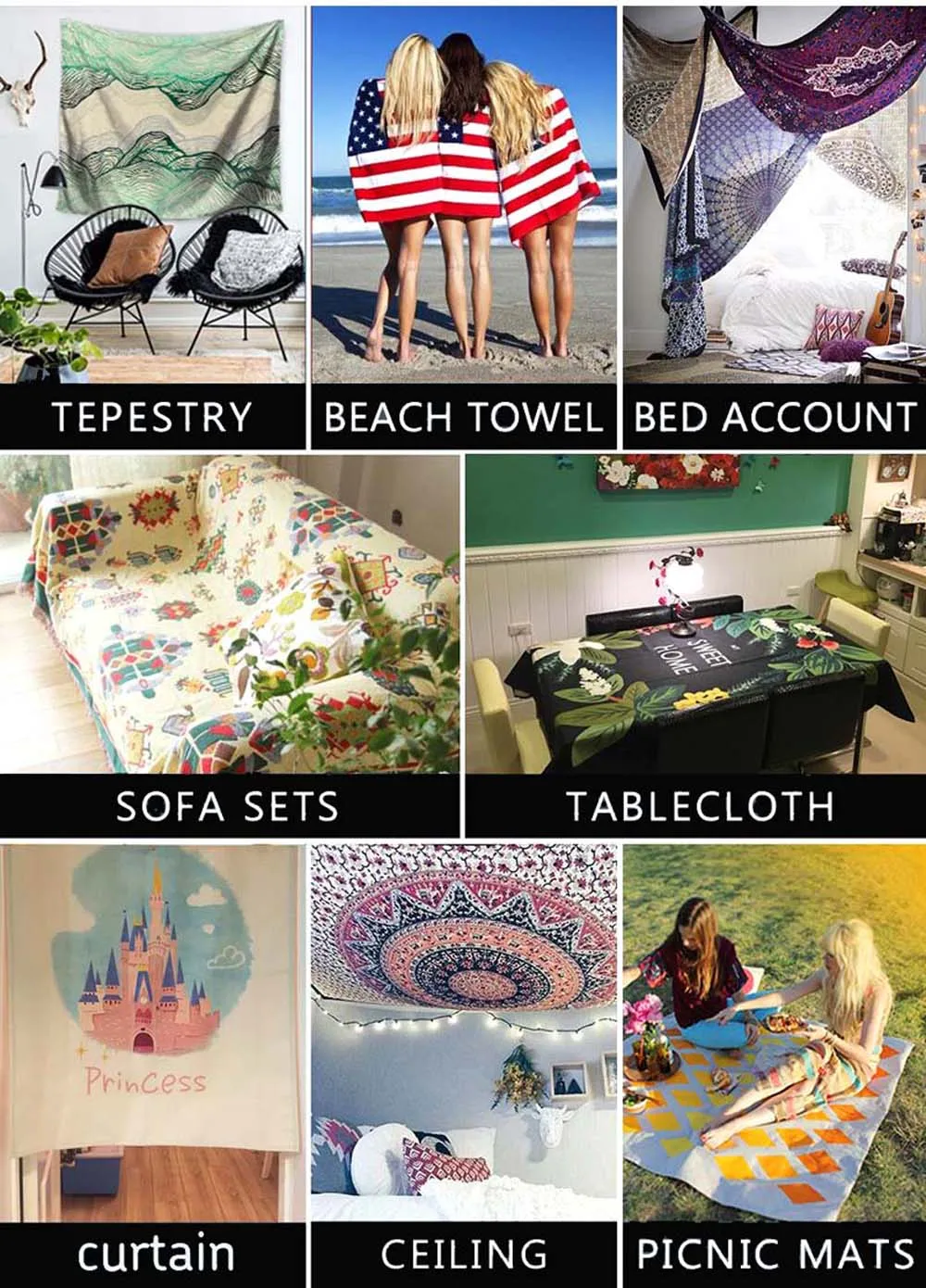 2. Эти гобелены можно использовать как одеяло для пикника, покрывало для кровати, пляжное полотенце, коврик для йоги, скатерти, занавески и, конечно же, как Гобелен или настенный подвешивание или декор или пледы на пляж, покрывало для колледжа.