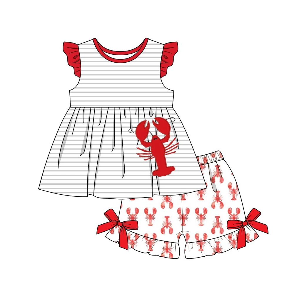 Летняя одежда для девочек; Серый топ в полоску без рукавов и шорты с принтом раков; Одежда для маленьких девочек с вышитым красным лобстером