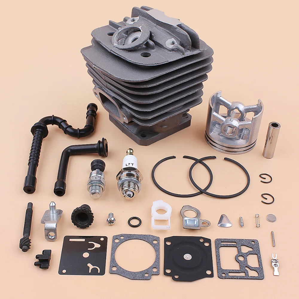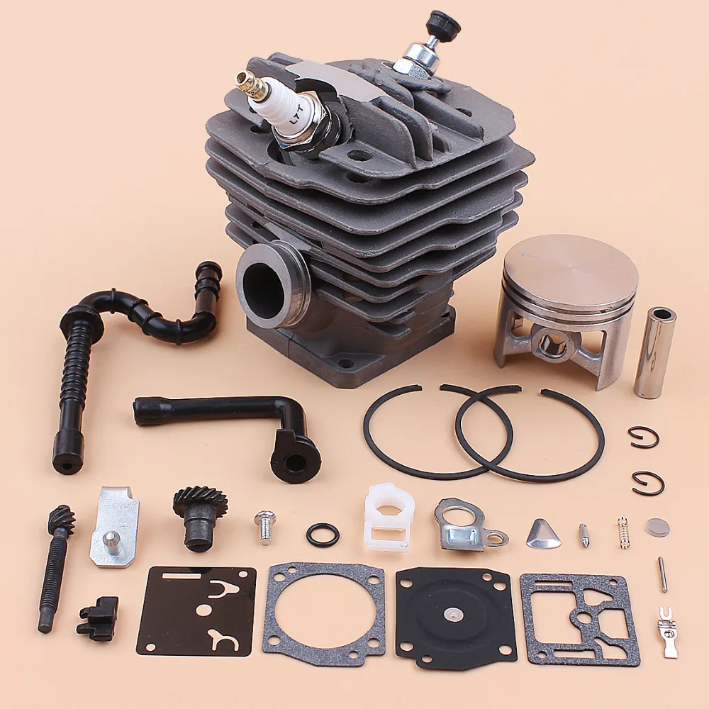Включает: 1 цилиндр, 1 поршень, 1 штифт, 2 кольца, 2 зажима, 1 Свеча зажигания, 1 клапан декомпрессии, 1 топливный шланг, 1 x Масляный шланг, 1 x натяжитель цепи, 1 x набор для Ремонта Карбюратора