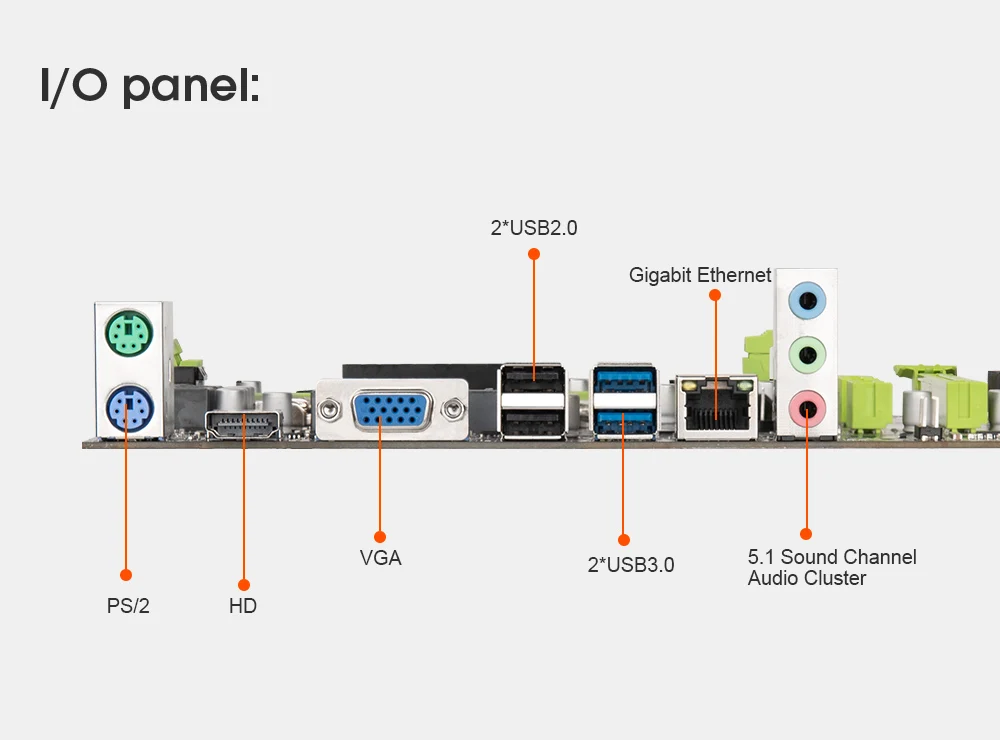 | Задний ввод/вывод | 2 * USB2.0 1 * RJ45 LAN порт 1*5,1 звуковой канал аудио кластер 1 * PS2 (поддержка клавиатуры PS2 + мыши) 1 * HDMI-совместимый порт 1 * VGA 2 * USB3.0 | |||||