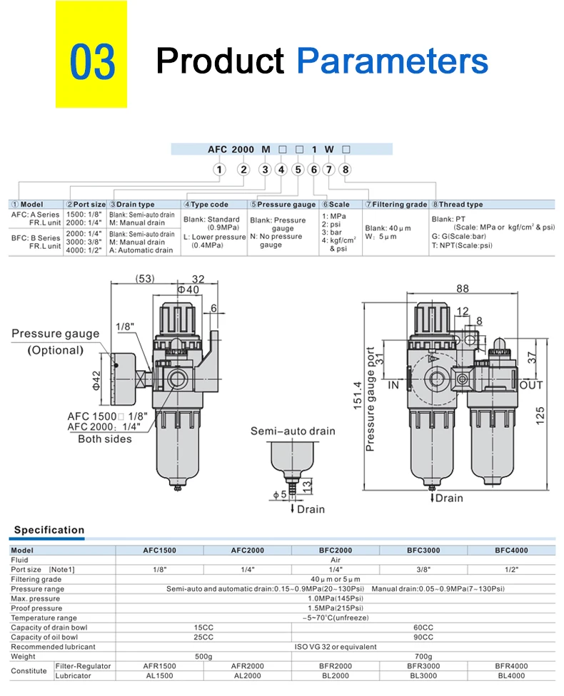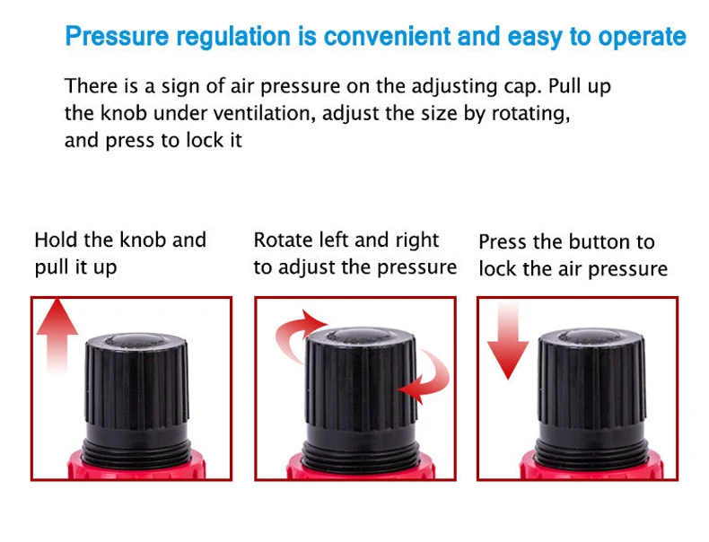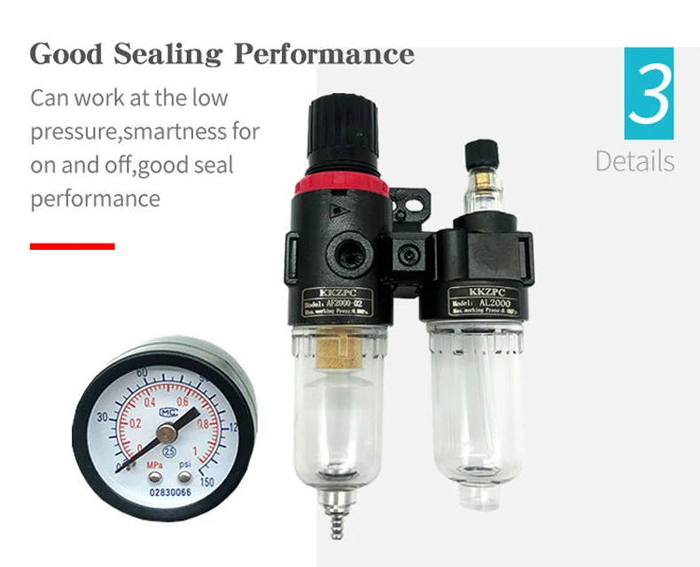 Название продукта:Регулятор воздушного фильтра AFC2000 Размер порта: 1/4" Материал:Алюминиевый сплав + пластик Рабочая среда:Воздух Макс. Давление:9.9 кг/см2 | 1. Окислительная обработка-полированная и жесткая анодированная алюминиевая поверхность. 2. Экологическая безопасность-Энергосбережение и защита окружающей среды с большой низкой скоростью, безопасностью и точностью. 3, хорошая производительность уплотнения-может работать при низком давлении, smartness для включения и выключения, хорошая производительность уплотнения. 4, классический дизайн-классический дизайн, прочный дизайн управления ai. |