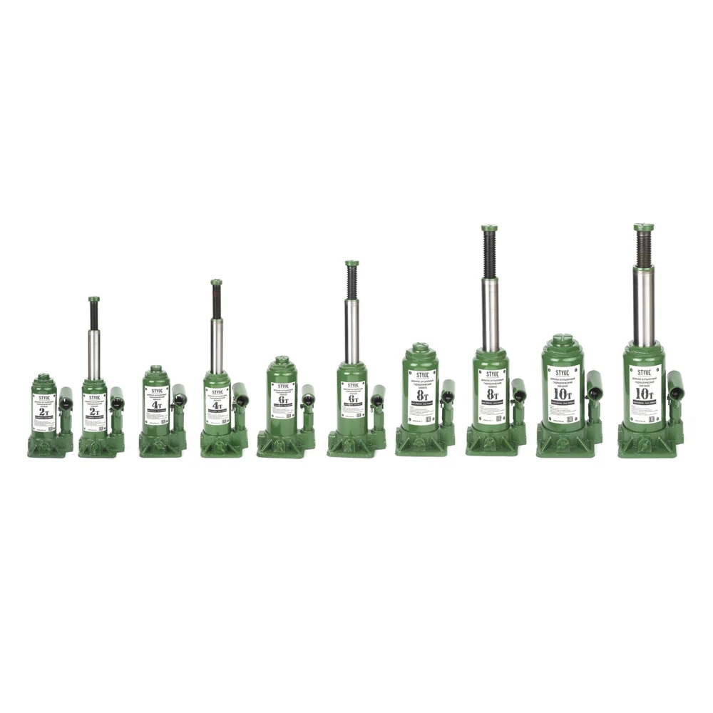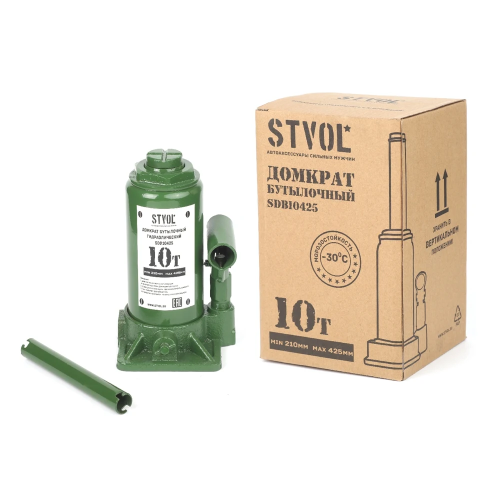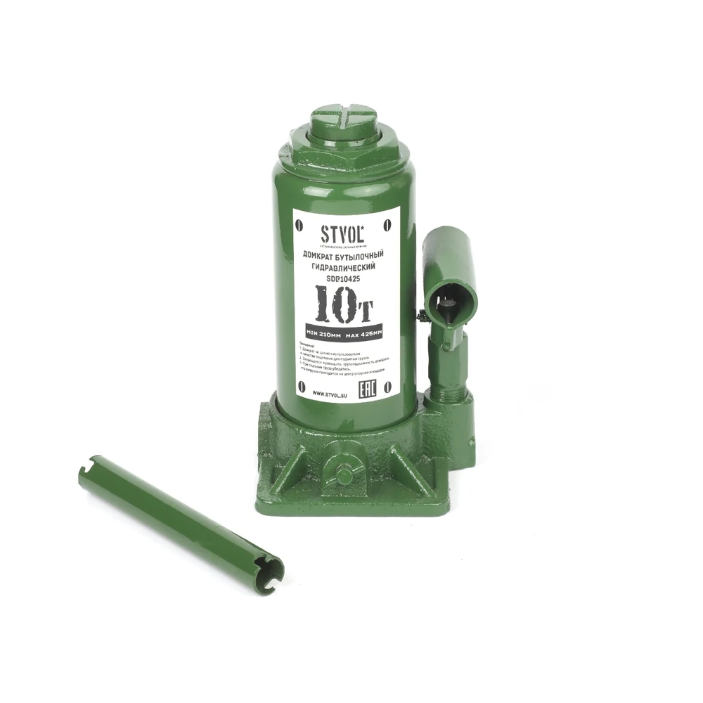 Гидравлический бутылочный домкрат STVOL предназначен для подъема груза массой до 10 т. Является незаменимым инструментом при работе в автосервисе, при ремонте автомобиля, используется при ремонтно-строительных работах.
