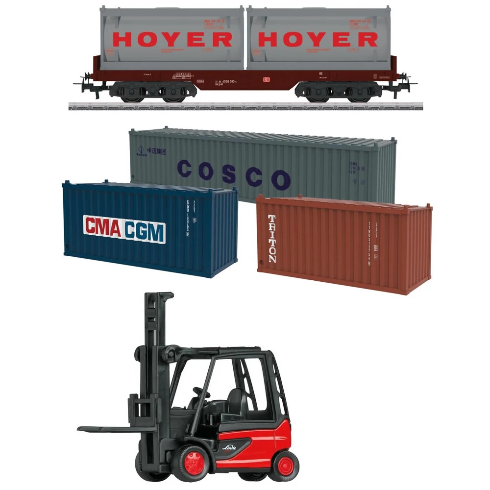 Marklin Startup (Стартовый набор) подходит как для детей в возрасте от 6 лет и старше, так и для взрослых, желающих начать заниматься миниатюрной железной дорогой в качестве хобби. В эти наборы входит все, что нужно для первого знакомства с увлекательным миром железнодорожных макетов. Стандартом для Marklin является воспроизведение моделей, максимально приближенное к прототипу - как в техническом плане, так и во внешнем сходстве. Макет дороги с легкостью собирается и разбирается, и не займет много места. Все модели поездов высоко детализированы, оснащены световыми и звуковыми эффектами. Для запуска предусмотрено цифровое и аналоговое управление. Поезда движутся по металлическим рельсам, а большой ассортимент локомотивов, вагонов и дополнительного оборудования позволит создать макет на свой вкус. Размеры и оснащенность железной дороги и составов ограничены только фантазией! Подарите себе и близким волшебный мир Marklin! Набор дополнений из серии "Контейнерная логистика". В наборе: вагон-контейнеровоз с двумя 20-футовыми контейнерами-цистернами, погрузчик, грузовой автомобиль, 2 контейнера, рельсы для железной дороги. Масштаб: 1/87 H0.