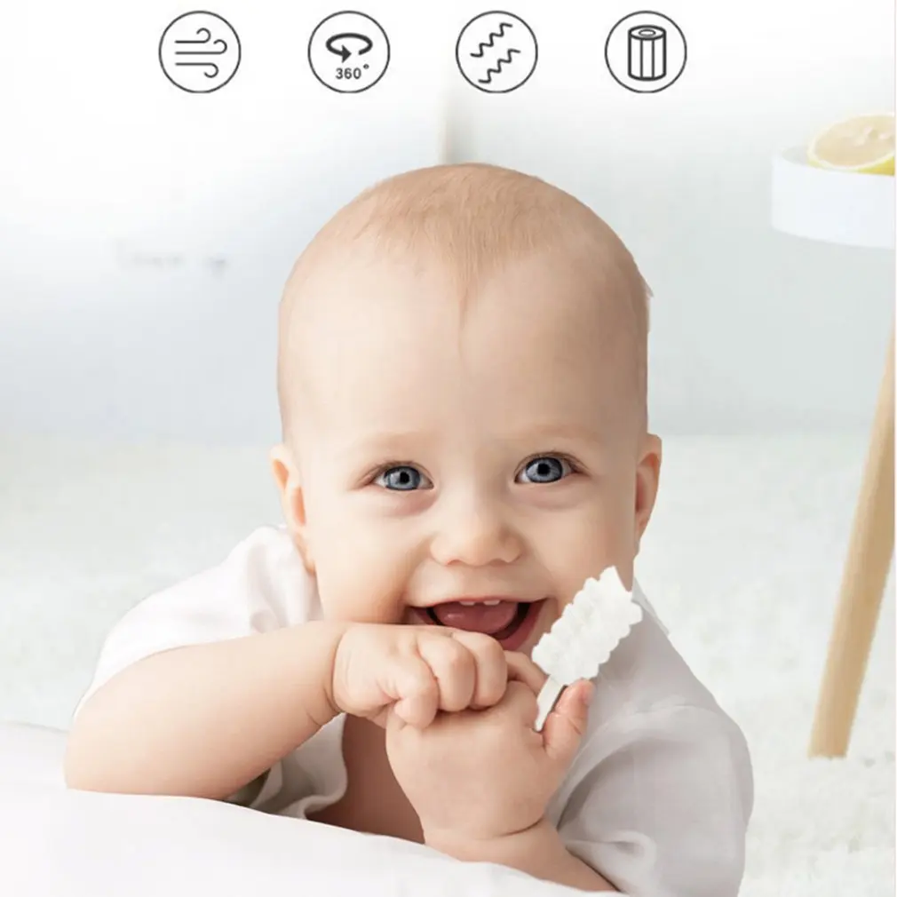 -Комфортный материал: 100% хлопок. Бумажная ручка безопасна и безопасна для вашего ребенка. 3D волнистый узор, можно очистить рот на 360 °. Мягкая, впитывающая марля для комфортного использования без повреждения зубов и десен.