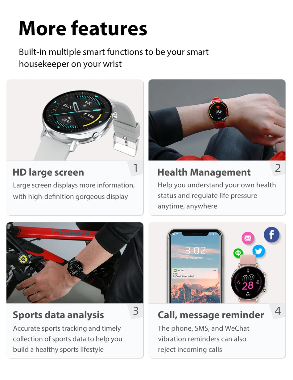 ● Поддержка сигнализации, питья воды, сидения, звонков, SMS (сообщения, QQ, Wechat, Skype, Facebook, Twitter, Line, Whatsapp), напоминания о потере. Часы будут напоминать вам вибрацию.