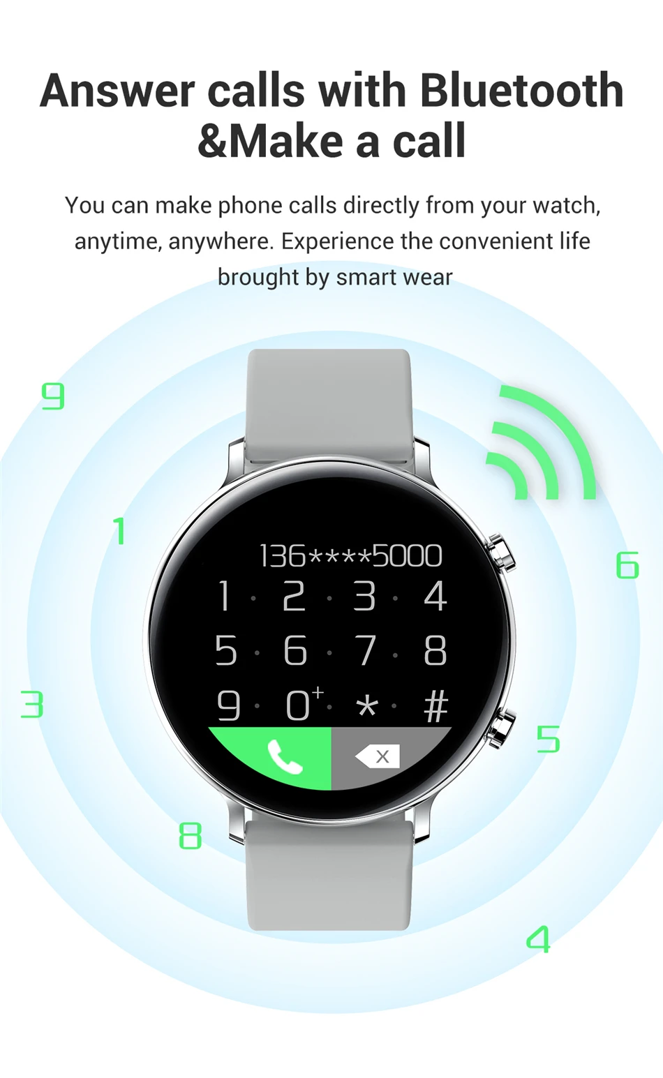 ● Это умные часы bluetooth для ответа на звонки. Вы можете использовать его для совершения и ответа на звонки.