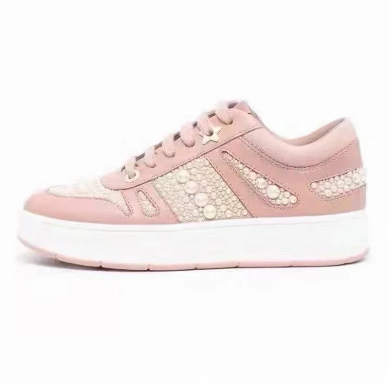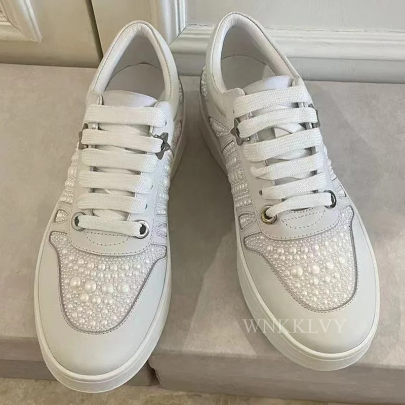 Сезон весна-осень; Маленькие белые туфли; Женская повседневная обувь на шнуровке; Жемчужное украшение на плоской подошве; Повседневные кроссовки из натуральной кожи для отдыха