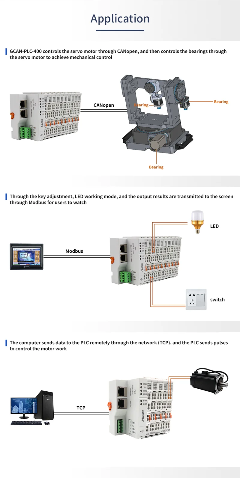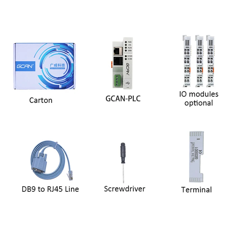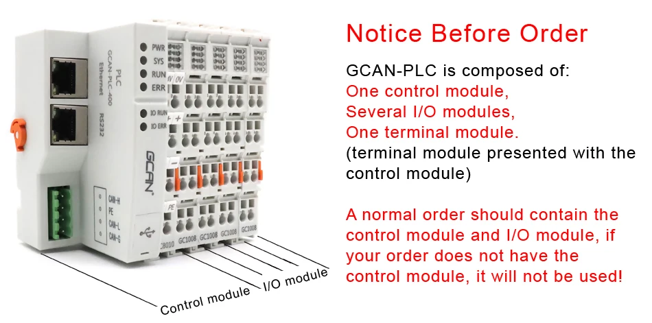 GCAN-PLC модуль состоит из программируемого модуля управления (GCAN-PLC-400/510/511) и нескольких модулей ввода/вывода (GC-1008/2008/...). Модуль управления использует высокоскоростной процессор и обладает мощной вычислительной и обрабатывающей способностью. Модуль управления также имеет различные интерфейсы связи на местах, которые пользователи могут использовать для подключения к соответствующей сети и общения с другими устройствами.