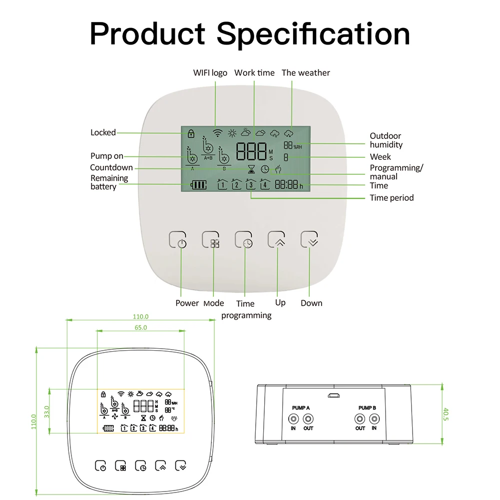 Это своего рода качественный интеллектуальный контроллер орошения, точное управление, энергосбережение и низкое энергопотребление. Большой светодиодный дисплей, четкое отображение данных, легкая регулировка и удобное орошение. 5 + 1 + 1 Еженедельный программируемый режим: поддержка набора 4 периода и установка времени работы для каждого периода для гибкого управления таймером. USB и солнечная панель dual power supplys ways design, не нужно повторно заряжать таймер полива или часто менять батарею. Поддержка управления приложением smartphone Tuya с ситемой удаленной поддержки, управление таймером через приложение, когда вы не дома. Совместимость с Alexa и Google Assistant для обеспечения голосового управления.