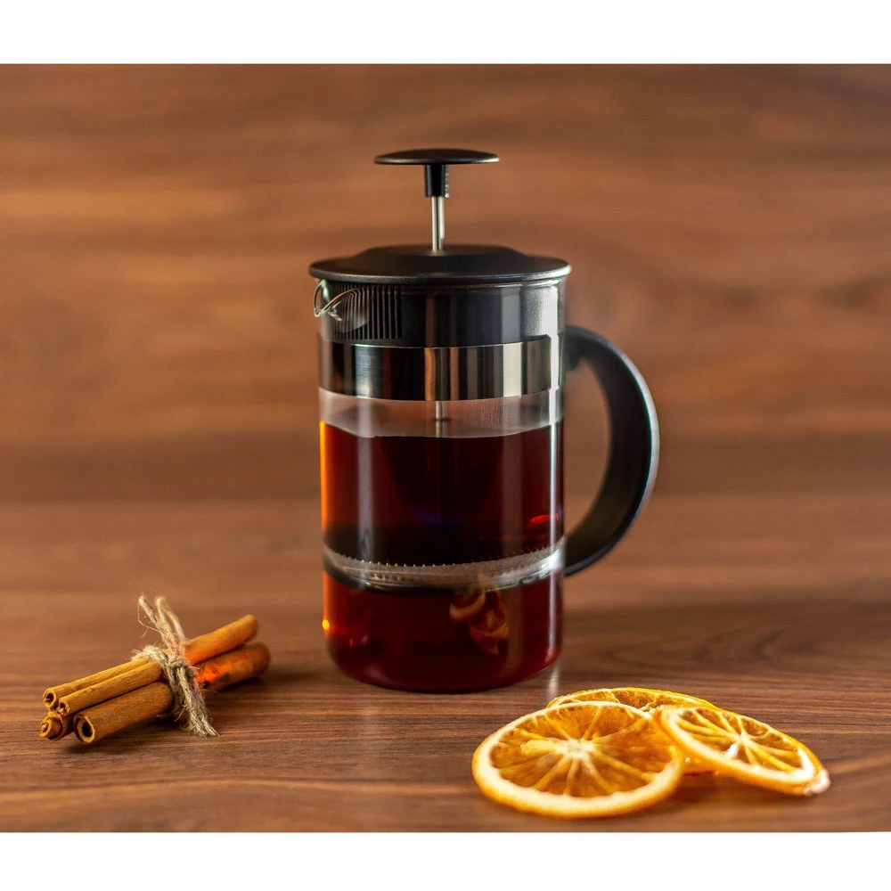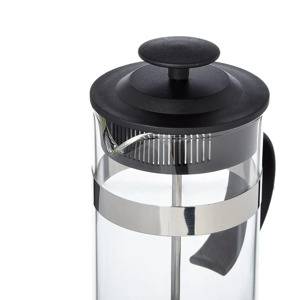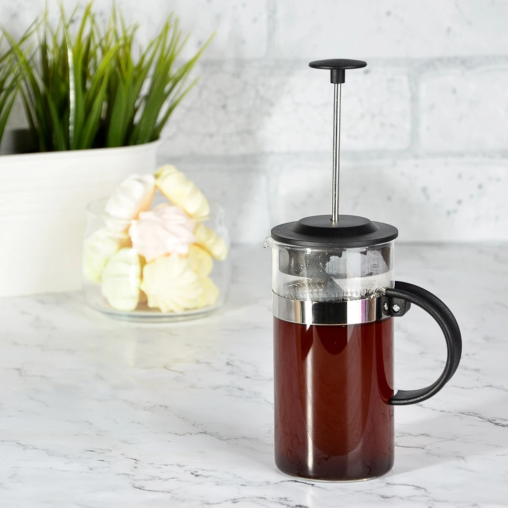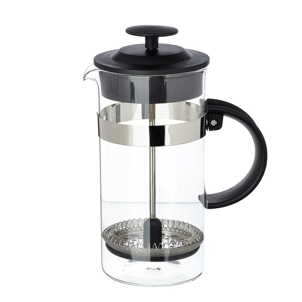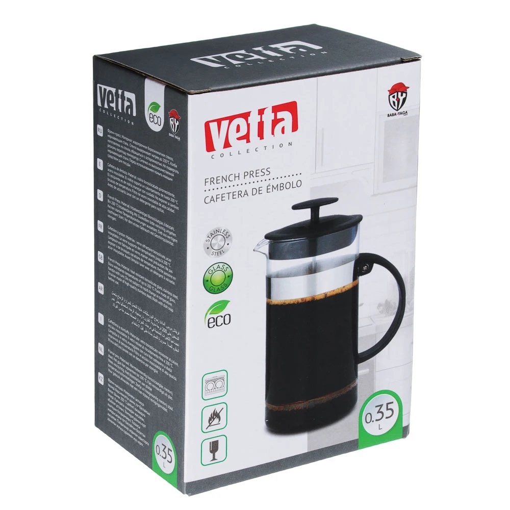 Френч-пресс из жаропрочного стекла объемом 350 мл в корпусе из пластика черного цвета и с фильтрующим поршнем из нержавеющей стали.