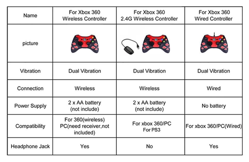 Для беспроводного контроллера Xbox 2,4G он подключается к приемнику 2,4G, так что вы можете подключаться к xbox 360/pc беспроводным способом, он также встроен в двойную вибрацию, ему нужны батарейки 2AA (не входят в комплект) И без разъема для наушников.