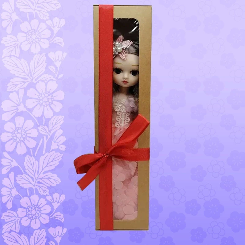 Кукла упакована в коробку с подарочной лентой.