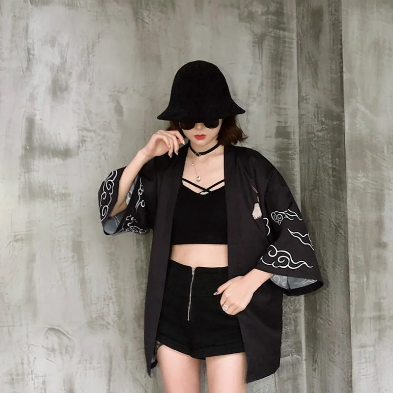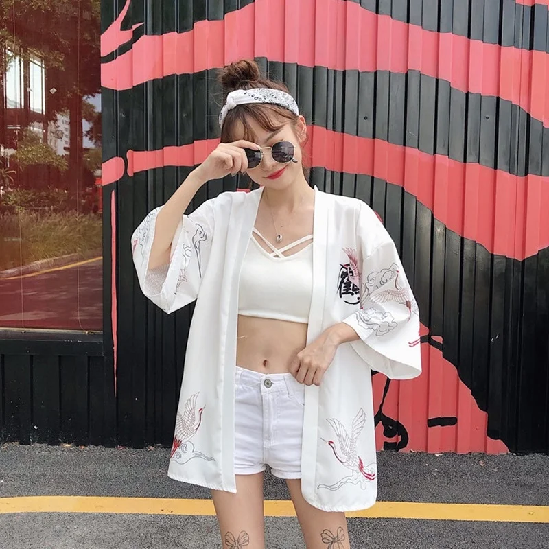 Пляжный кимоно японского стиля для женщин Yukata с принтом журавлей, летняя традиционная уличная рубашка-хаори, картдиган-оби.